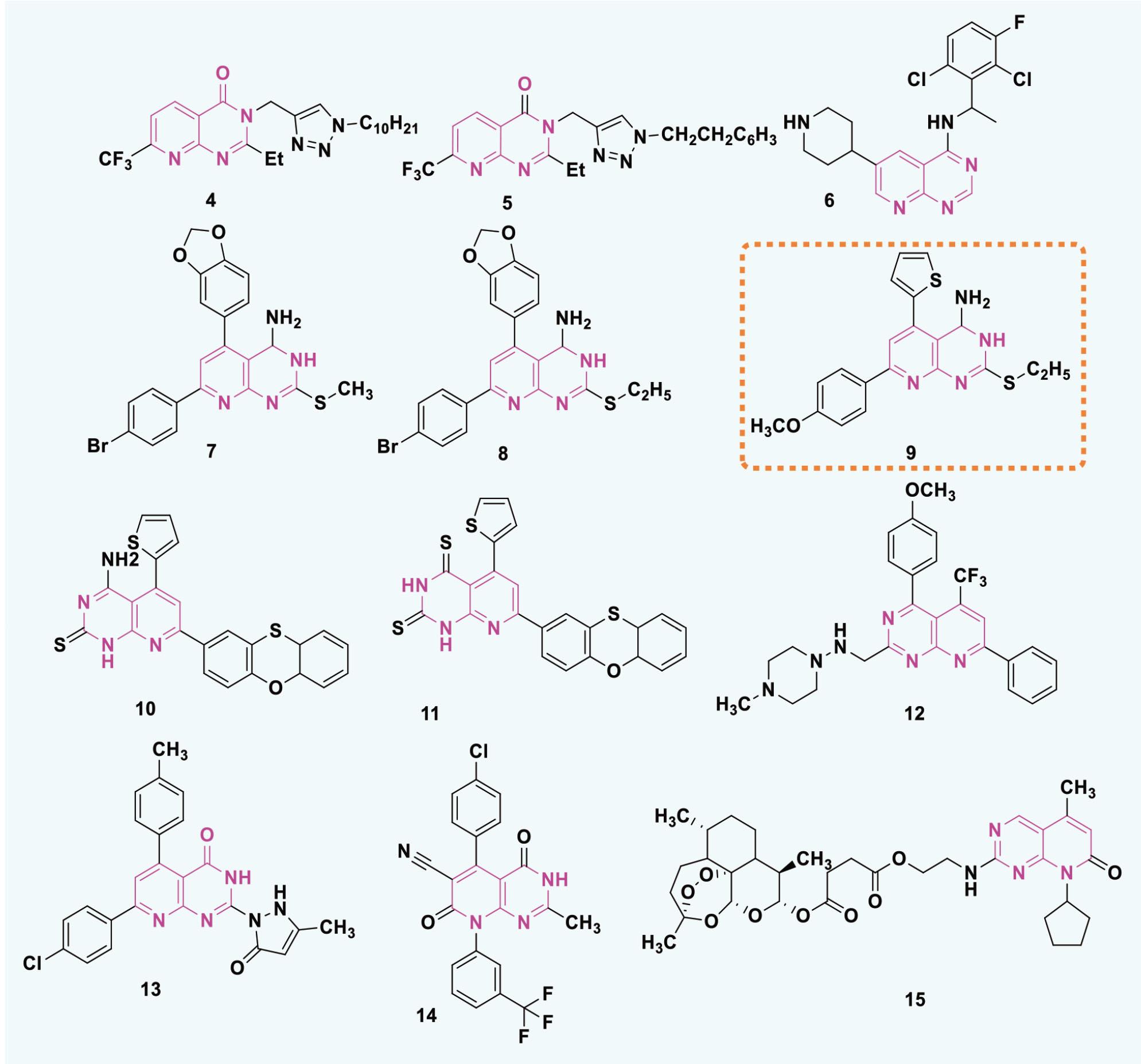 ![Structure of pyrido[2,3-d]pyrimidine framework.](https://sciendo-parsed.s3.eu-central-1.amazonaws.com/69970fb10883ce575fb68836/j_abm-2025-0035_fig_013.jpg?X-Amz-Algorithm=AWS4-HMAC-SHA256&X-Amz-Content-Sha256=UNSIGNED-PAYLOAD&X-Amz-Credential=ASIA6AP2G7AKBODIFHJH%2F20260220%2Feu-central-1%2Fs3%2Faws4_request&X-Amz-Date=20260220T202814Z&X-Amz-Expires=3600&X-Amz-Security-Token=IQoJb3JpZ2luX2VjENP%2F%2F%2F%2F%2F%2F%2F%2F%2F%2FwEaDGV1LWNlbnRyYWwtMSJIMEYCIQDdcJB0Vdr5f2YK9mj%2B4a35KIlevNaVFisM%2FLSPBBMbpAIhANweRjQPjRnIQU9iGct1jQPZVlYGL%2F%2BlnPXivXVVeCZdKsQFCJz%2F%2F%2F%2F%2F%2F%2F%2F%2F%2FwEQAhoMOTYzMTM0Mjg5OTQwIgymGe2EIqav2f4AbEYqmAWYaekdiUuA8tsGhBwI74jvu%2B6RgITIDZpZvwArR3i2fBz96hGUJxzprDeIIHzd9ynPZaVbUnnuyqYnpEBCXlXUXyVcJWw1E%2BU37esjhEvNE2qysPxJy%2B4WQYCq5BnBAP0RCUNOj0GWHoc10zZ99T4nbA4K79rA9YRK0uLZddWnDNVoF6qcaeptHCaW0nno%2Fx26DjuBZbL%2FSXFh9DhQmsJVSG6qUeVLg8Vsw6BFYEX%2Fh39HBxpOgrImtAosIuyCUFnINs%2BeMzRad37oYKmS%2FJGwKbqgGIAwvvP55dVJvn0CZ4LB2FRmL%2BygE0M95k08HRIweYOQ6W%2F573ekDbWH86KQtJbZyM33tu3Fr1BXbptSiAwXd%2FCJsGBUpdF2Q%2BR5X9i8vqW3dwthXaFQBMz4u0SuN%2Bo9NI2wxNZzbK%2FrXIYludV5Bc1q6qz9YJ2u2xQQk6Zfffmhno8Ph15qbuW%2BSrbkFG52IwcOgsk%2F%2F00HcgalaIbEHLpzOH2ici5iDfDxBpS%2BXCOIBzoO9CsmSMxkOgHjaXFySuhuwJrDrMfI1NlrjajtP2UREyFCiGxcIrCax8sNZZ5Cx2swAm8YCmTSZzu52fUeSvb%2F2C3uTA2S6amWVV47jI9b8DaWW4BH2It6IyIfVYHuTKPexC%2F%2FkGn7vUpUF6Baa1IOtPVnqsgZ9gfQAVb57Rc27qbwhLsdELhln2u9QgRvjO88%2FmVYjckMrViB9sPzeqX12qviX7xKsHWMWlxUswkK3fK5J2%2BCSsh1pb8AtvfSNgFEF58E1dkr54m8s1ix36FdjfVvQ3EG5iVU2DmxTLjNTxAYVj4VoU%2Bgb8kHz%2FB73VuzijVitYu2E8To2HzkZseEz6lL%2BCaSUOQgPOQ77M%2BhD5IdMIXT4swGOrABDNXOkXrP9N%2FmYSsRnSZ6gRxNQ0QX%2Fn2p%2FGpw3k1q9%2BYBk0PJ0xDWMJuWqm9sS6c4ExveIoVP3NGuE8GRYCC6MzCOmxCUphVsmQ6zsCtYgXhKKmXAowwYxjY%2BYkN%2FX%2BnbB2hNxQ7ZmWrSbiS9yPqvQBXCvq2i3wHKYynWYhrveaBm%2BT8rI%2FmQlmosNiQPCAx0cVFXi6XVcQ%2BfvDafVM87y1WT6IqxXduCJ9zrt6%2BnO8U%3D&X-Amz-Signature=715495fef93a94a1e51d080fd25b578d41644b3b558a558fa73afb10326dc021&X-Amz-SignedHeaders=host&x-amz-checksum-mode=ENABLED&x-id=GetObject)