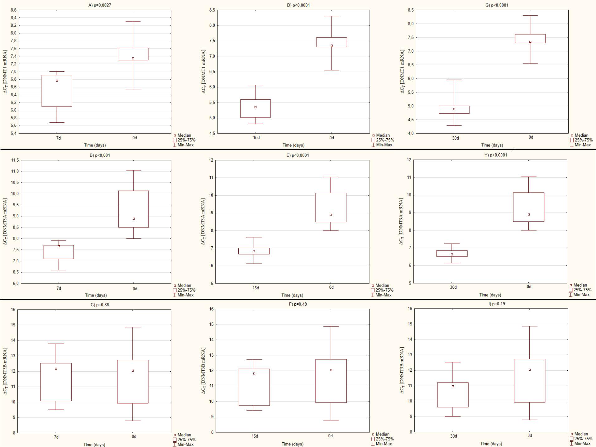 Comparision of ΔCT values for analyzed DNMTs mRNA levels in different stages of culture. All calculations were made in relation to the expression levels for the individual genes at the time of beginning of the culture