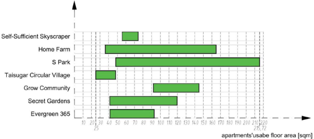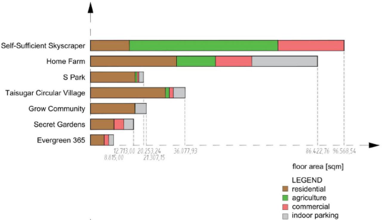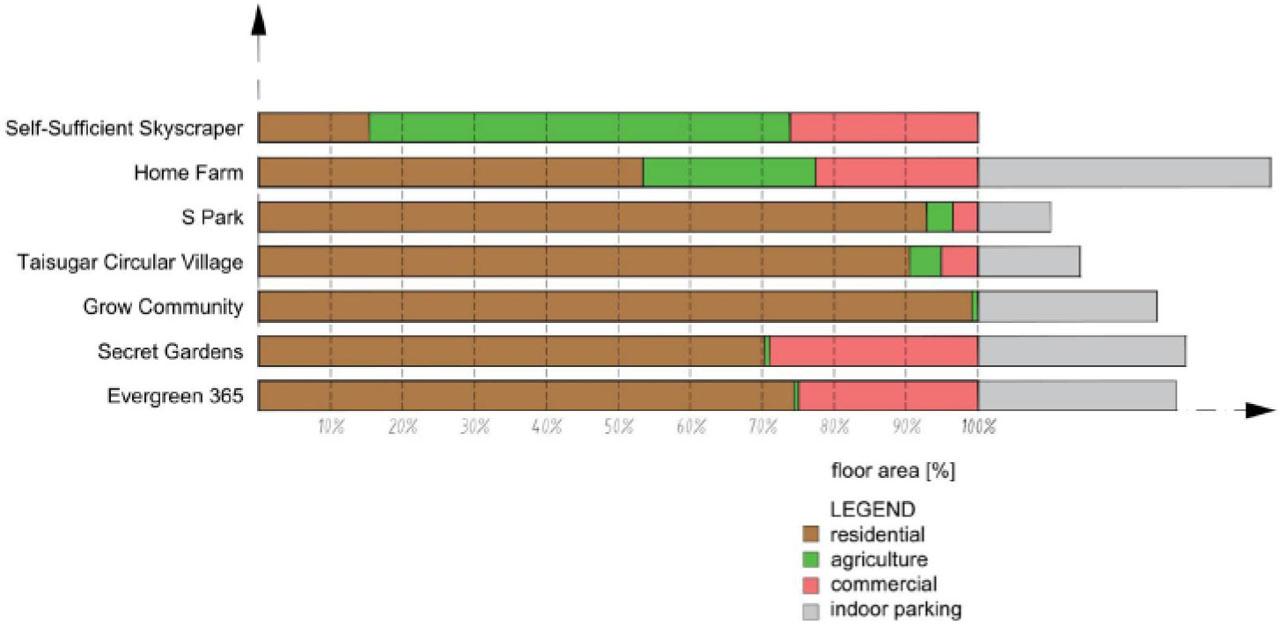 The analyzed solutions concern high-rise buildings and skyscrapers. They assume an extremely radical change in the approach to the way of contemporary living, analyzed on an urban scale, as well as the adopted functional program and the method of its implementation. Facilities assuming full self-sufficiency have a relatively small living space in relation to the area of indoor farming. Functions are related to each other in a way that could be called traditional – without full integration, the linkage occurs through limited internal communication paths, vertically or horizontally. An important feature of the discussed solutions is the fact that they are the most comprehensive ones, and therefore also the largest in terms of both the usable floor area of apartments and their number, as well as the cultivated area in total. In the extreme case of the oldest concept under discussion (Self-Sufficient Skyscraper), over 58.5% of the agricultural area was assumed in relation to the general utility function (excluding the area of built-in parking lots). As the idea developed, the more realistic concepts were, the more this proportion shifted towards reducing the actual size of farming areas in favour of services and parking areas.