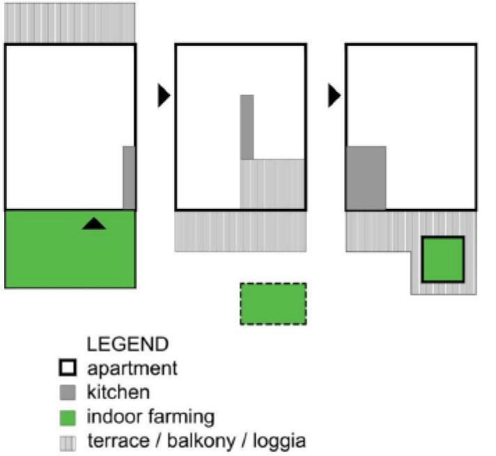 The introduction of farming greenery into apartments’ interiors and linking housing with agriculture was possible as a consequence of a closer connection between architecture and green, and the implementation of sustainable design principles on a larger scale. A more complete integration of functions was possible by creating a canon of forms and the scale of this connection. Certain patterns of solutions have become relatively easy to combine due to their convergence with elements that have already become a part of residential architecture. The combination of housing and agriculture should therefore be slowly treated as a close relationship, where the farming is fully dependent on the housing part and replaces certain elements of complementary functions at the same time. Simultaneously, the adopted direction of development goes towards total dependence between functions, i.e. programmed self-sufficiency causes the residential function to lose its sense without agriculture and vice-versa.
