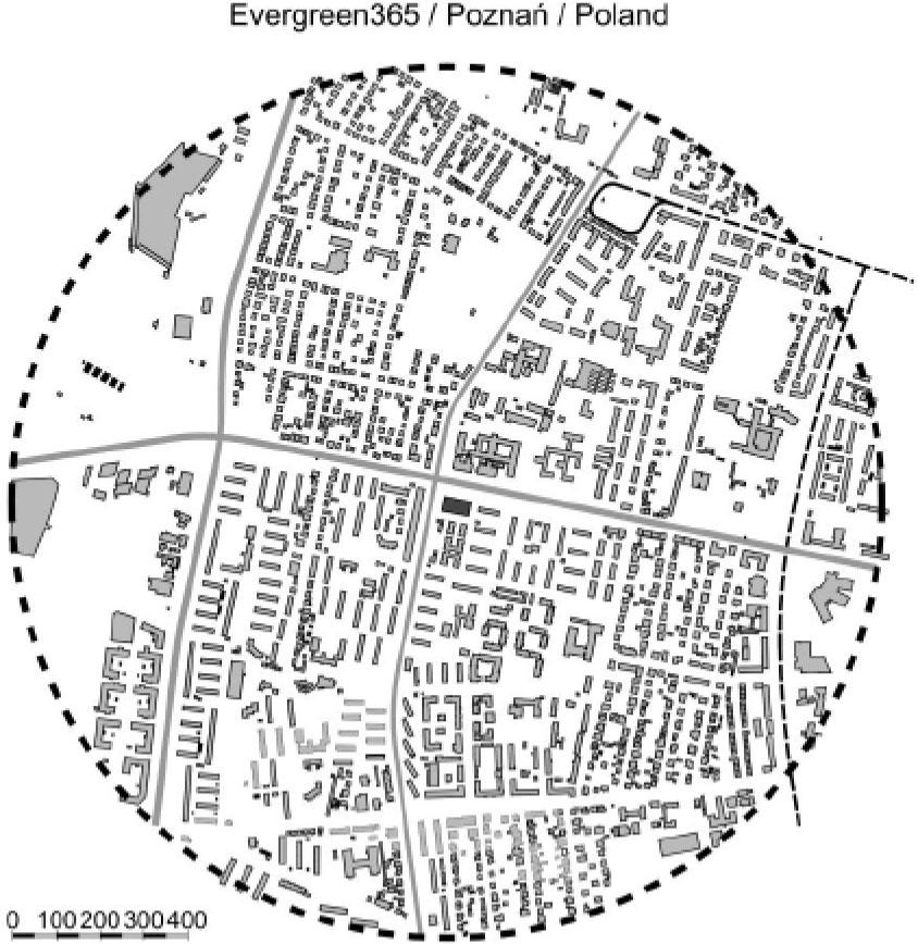 Morphological analysis of housing estate Evergreen 365 in Poznań within a walking distance of 15 minutes (1000 m radius). Author's own elaboration