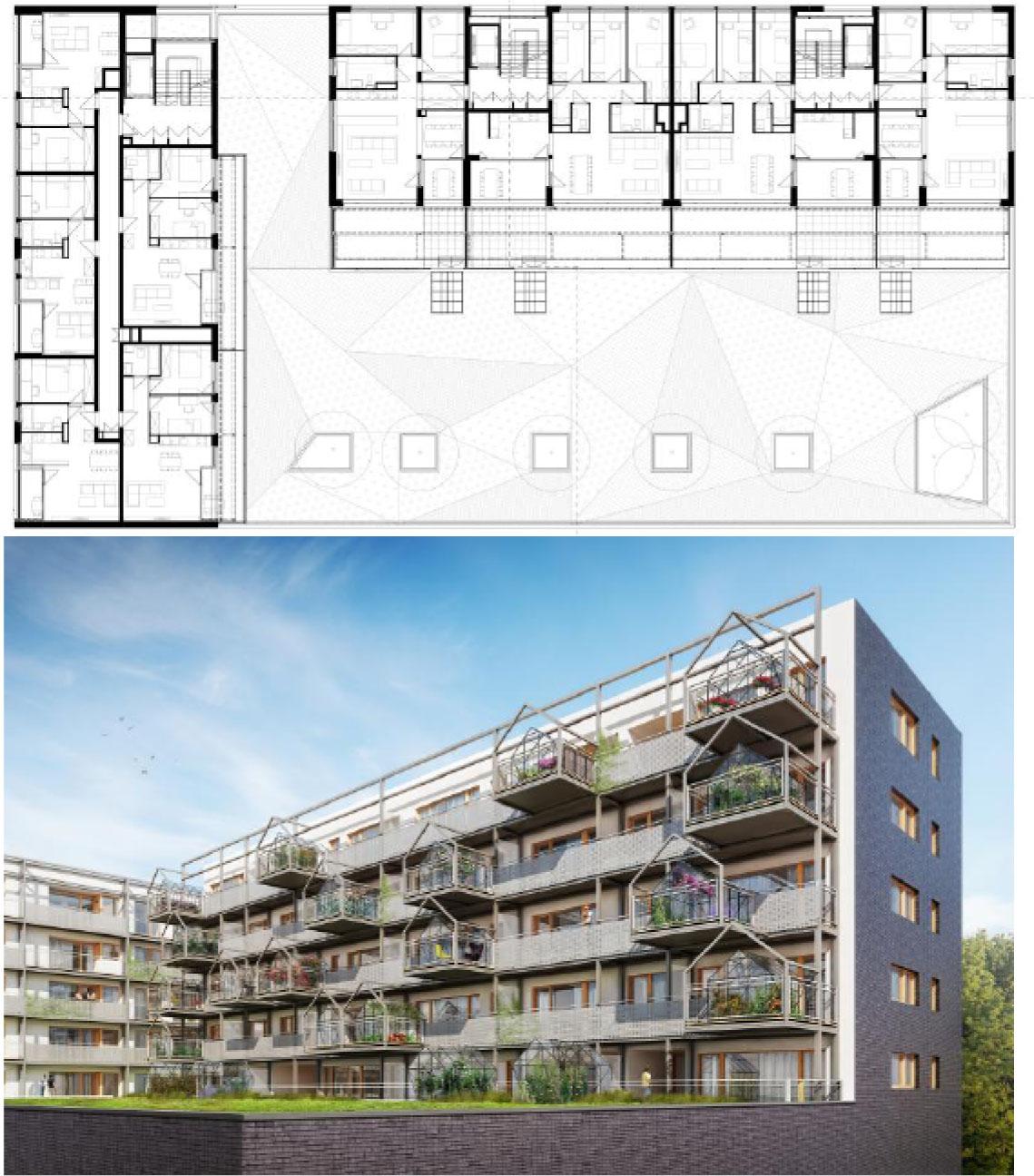 This last trend also includes the only Polish example of this type of housing estate so far. The Evergreen 365 estate in Poznań is characteristic in that it offers a new type of solution for the external space of the apartment, as a combination of balconies and greenhouses, the development of which was left to the owners. Hence, it cannot be unequivocally assumed that all of them will actually fulfil a farming function, especially since they do not have, apart from the greenhouse structure itself, any technical facilities dedicated to cultivation.