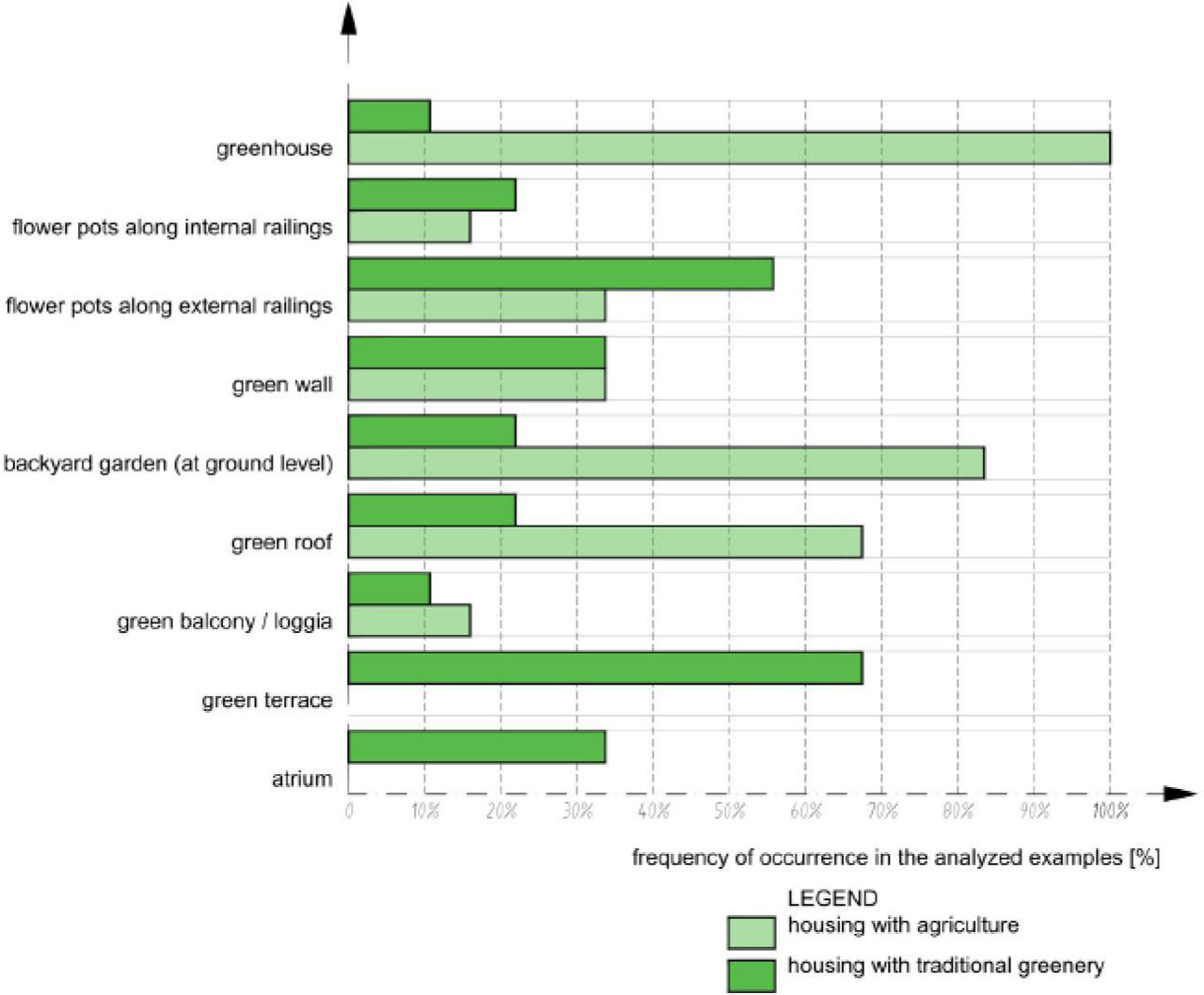 In the case of multi-family housing, the emergence of agricultural greenery changed the way the greenery itself was integrated with architecture. At the same time, forms of its occurrence have also changed. While in the case of traditional greenery in the analysed examples it was most often in the form of permanent, large-scale pots integrated with external balustrades, green roofs and terraces, but also, although slightly less often – as green walls, in the case of introducing agricultural greenery, these were not so popular. In the case of housing estate agriculture, it usually took the form of a backyard, individual gardens in the ground floor area or roof greenery, but primarily as greenhouses located in various places on a plot or integrated with the building structure. This form appeared also in the case of traditional greenery, but it was a marginal element, not as popular as in the case of urban agriculture, where it was present in all cases. The new form of multi-family and mixed-use urban housing is already creating its own catalogue of spatial solutions linking this specific type of greenery with architecture in an even more durable way. In this case, greenery becomes an integral part of the building, more and more independent of external conditions.