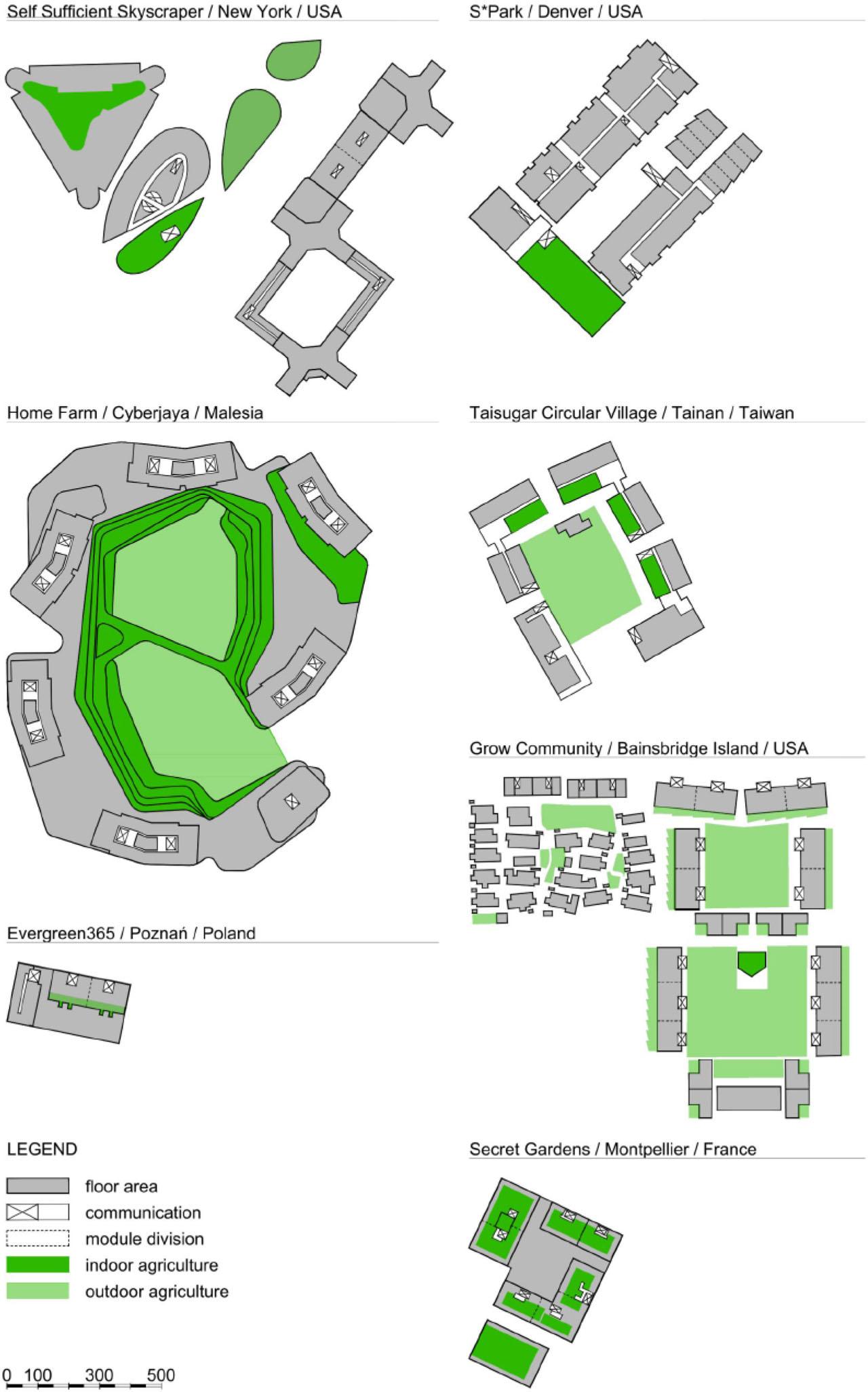 In the second group of estates emerging at the same time, there is an even more pronounced tendency to marginalise agricultural and service functions. In this case, the amount of cultivated land in the total usable floor area does not exceed 1%, which makes it difficult to see the declared emergence of urban agriculture in developments such as Secret Gardens and Grow Community as a real change in the way urban housing is designed. This is particularly evident if one compares these volumes to the analogical ones in the theoretical projects, in which the (even merely declarative and therefore probably overestimated) efficiency of urban farming was taken into account in shaping the functional programme, and on this basis, the necessary area of cultivation for at least minimal food self-sufficiency of the settlement was determined.