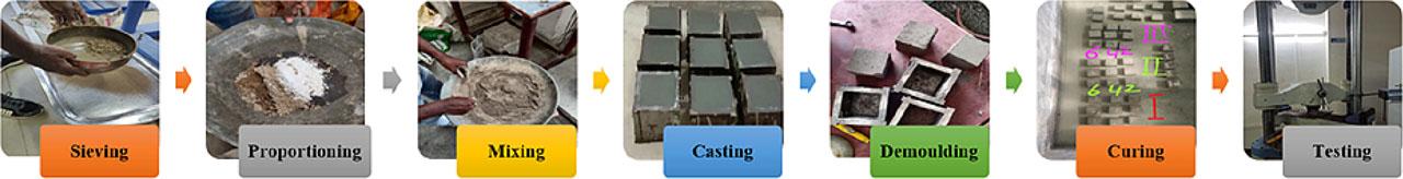 The different waste materials were first sieved through a 75-micron sieve and the fine fractions passing through the sieve were used for preparing the block mixes. Following this, the three different solid wastes were taken in different proportions. The quantity of PG was fixed at 10% as too much PG is detrimental to the development of strength [24, 25].