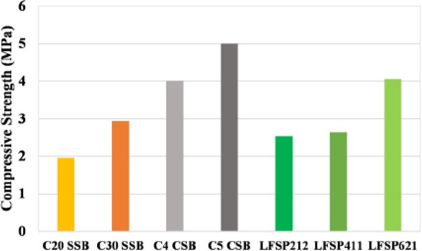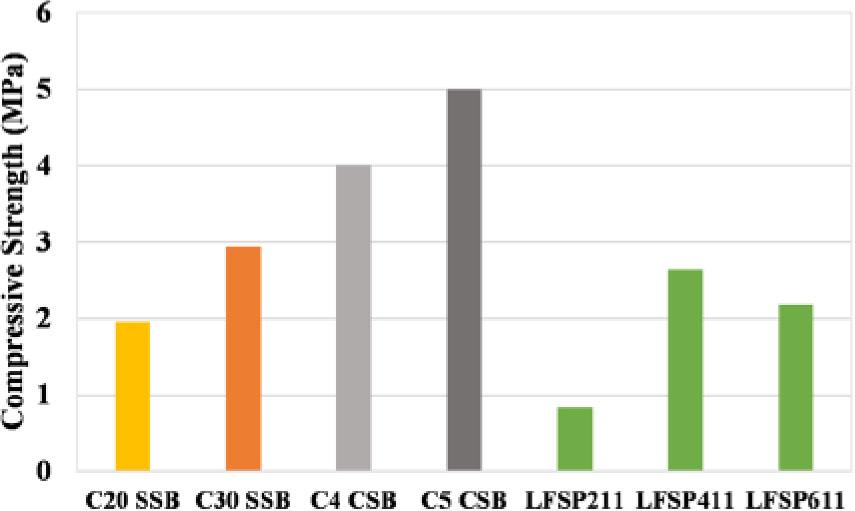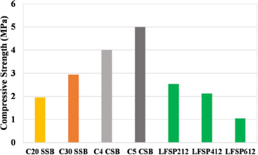 The compressive strength test on the stabilized solid blocks was done based on the procedure recommended by the BIS code. According to the BIS specifications [29], there are two classes of stabilized soil blocks (SSB), viz. class 20 with a minimum permissible strength of 1.96 MPa and class 30 with a minimum permissible strength of 2.94 MPa. BIS code [30] also recommends two classes of solid concrete blocks (SCB), viz. C4 and C5 with a minimum permissible strength of 4 and 5 MPa, respectively. Figure 3 shows the compressive strengths of the group LFSPX12. The strengths of the two classes of SSB and SCB have also been included for the purpose of comparison.