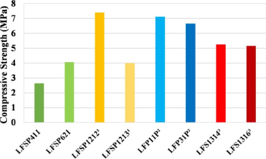 The mixes LFSP212, LFSP411 and LFSP621 developed compressive strengths of 2.54 MPa, 2.64 MPa and 4.06 MPa after 7 days of curing, which were maximum in their respective groups. Thus, these mixes can be considered the optimal mix proportions in their respective groups. However, the mix LFSP621 developed the maximum strength of all combinations tested and hence, it can be concluded that the solid waste blend consisting of 60% FA, 30% SS and 10% PG stabilized with further 6% lime by weight of the solid waste mix can be considered as the most optimal mix for developing maximum strength of the solid waste blocks.