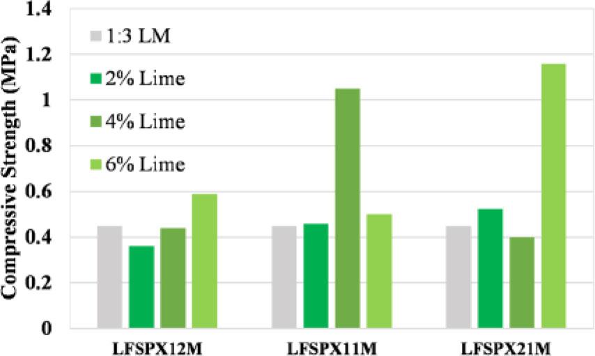 From the figure, it is evident that the strength results from the present study were lower when compared to the results from earlier studies. The common material in all the studies is lime and FA. Study 2 has PG as an additional material whereas study 3 has SS as additional material. The lime contents adopted in studies 2 and 3 were comparable to that of the present study. The strength of the stabilized composites in study 2 were 7.11 MPa and 6.64 MPa for LFP11P and LFP31P, respectively whereas the composite mixes in study 3 developed strengths of 5.26 MPa and 5.15 MPa for LFS1314 and LFS1316, respectively. Thus, it is clear that the addition of PG to the lime-FA mix has developed good strength of the stabilized composite mix. Addition of PG to lime stabilized soils hastens the pozzolanic reactions resulting in quicker strength gain [45, 46]. The addition of PG to FA-lime systems results in the acceleration of the pozzolanic reactions [24, 38, 47]. Similarly, in study 3, the introduction of SS in the lime-FA mix also developed good strength. Despite using significantly higher proportions of SS in their mix, the composites in study 3 were capable of developing reasonably good strengths. This may be explained based on the chemical composition of the SS used in study 3. It had a good proportion of silica and alumina and a very low proportion of magnesia (MgO). This magnesia has a slow reaction with water [48], thus leading to a delayed hydration. The very low magnesia content in the SS used in study 3 may have been very beneficial to their mix and hence, was capable of developing good strengths. Clearly, both studies reported good strengths in the absence of one of the materials. In the present study as well as study 1, both PG and SS are introduced in the mix along with lime and FA.