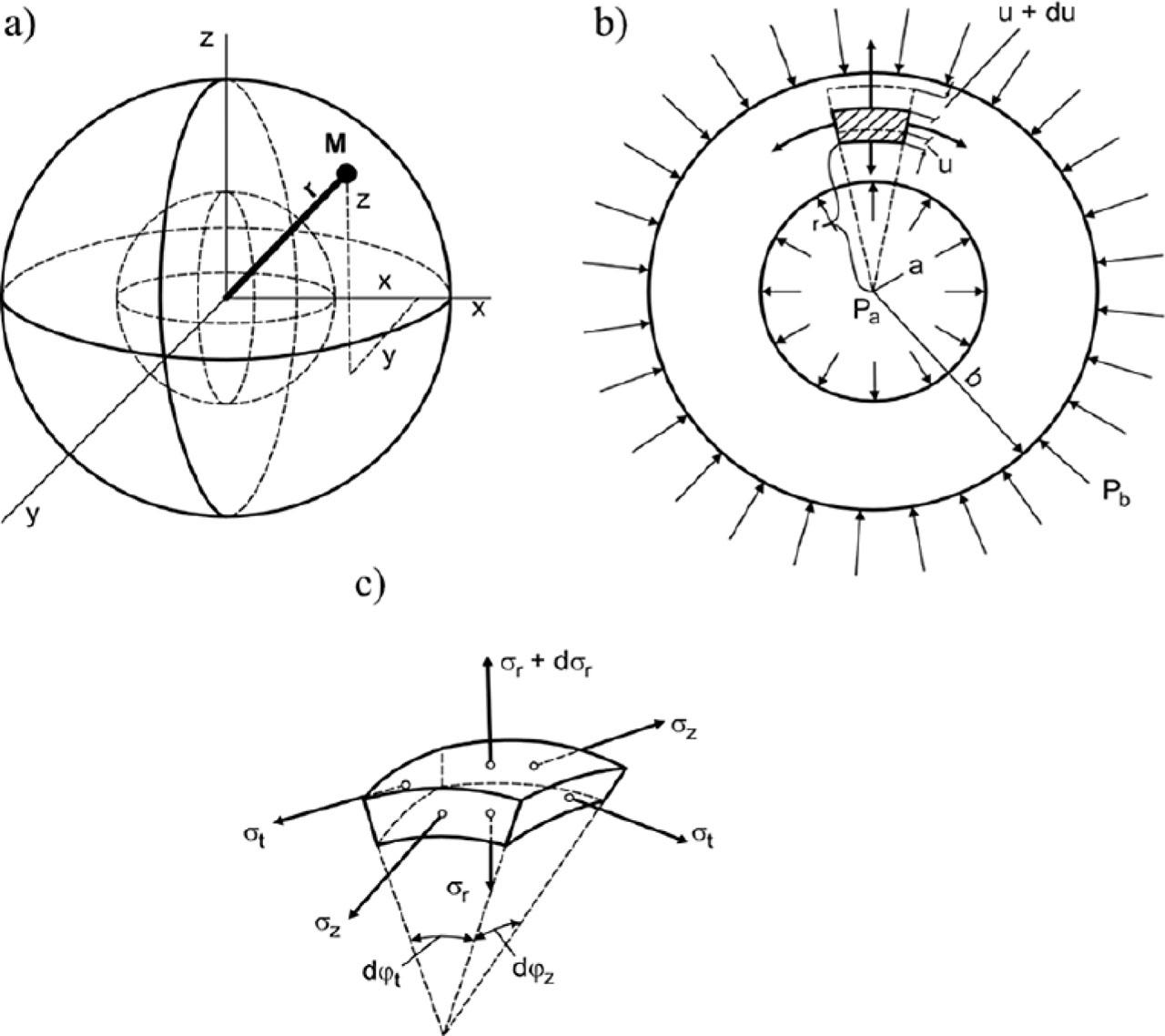 It was assumed that the sphere is mentally cut out in the vicinity of the pore (the inner sphere in the model) (Fig. 4). Therefore, there is no external pressure, i.e. pb = 0. We will then obtain the following formulas for stresses occurring in the adopted model [30]: