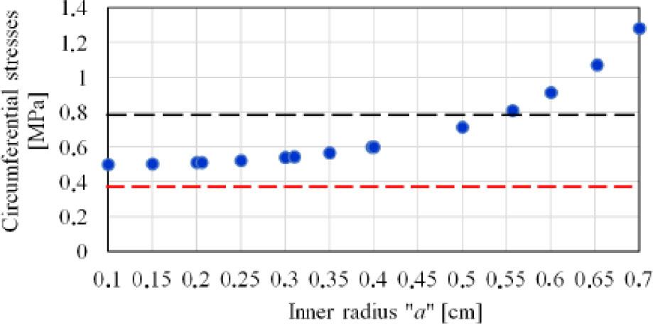 Based on previous analyses, Fig. 6 shows the load-bearing area of the analyzed sand-lime plaster. In this graph, the red line marks the value of 0.39 MPa (the average value of the tensile strength of the plaster), and the black line marks the maximum value of the tensile strength of the analyzed plaster. It should be emphasized here that the circumferential stress values were calculated on the basis of the adopted model for the internal pressure Pa=1.0 MPa.