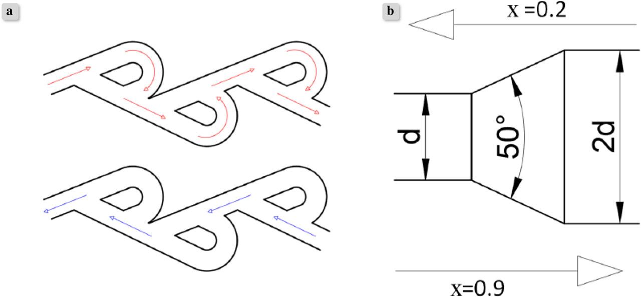 ![Examples of shapes of air channels where pressure loss strongly depends on flow direction a) Tesla valve [13, 14], b) diffuser, pressure loss coefficient × from [15]](https://sciendo-parsed.s3.eu-central-1.amazonaws.com/64b9094864573c28bc2b890f/j_acee-2023-025_fig_001.jpg?X-Amz-Algorithm=AWS4-HMAC-SHA256&X-Amz-Content-Sha256=UNSIGNED-PAYLOAD&X-Amz-Credential=ASIA6AP2G7AKLED2RARW%2F20260221%2Feu-central-1%2Fs3%2Faws4_request&X-Amz-Date=20260221T031915Z&X-Amz-Expires=3600&X-Amz-Security-Token=IQoJb3JpZ2luX2VjENf%2F%2F%2F%2F%2F%2F%2F%2F%2F%2FwEaDGV1LWNlbnRyYWwtMSJIMEYCIQC71LEj6JHBMRMVRkMOuxEVE4zJWAYYPQt0jdvO1mYKLgIhAOTbHIzNGPgViInVKXS7CfWuQ64j%2FqHJKDZ5Y%2F1UVMDBKsUFCKD%2F%2F%2F%2F%2F%2F%2F%2F%2F%2FwEQAhoMOTYzMTM0Mjg5OTQwIgypUdV3Rl9rh0zX%2FIAqmQX00mBi%2BgHUpby33nBXAm9zvdzTSmoUzCfp%2BEeuGENGeU8rk7irPUkG28w%2F%2BGCAZGD823tUGBq49kMTdr6FfSxKghjIzxnvxMf00c2JEtGf9i2vJr5Ag9NCEfqKFsCEWEtn3SSbR5wSE4SfQWU9%2BRv3pPU5Yy5Ym4ZfOMMnp%2Fi0CsOCjIMH4DqXyc4Qmu3mx7lNOFPoKCadHXaJxgQRpnvq0AuR6qCkUIqX6OkPb81sGH9SBi6Z%2FSmv9TFJKdsXAACBKR63AjaQPIQFgSInuXESDLDzjf3%2BY5GA%2B3h0qcAGmcAcP0x3NDuvreXqna6wJz6ez1I%2FLstvkJnb0CV6J9MfVQ8nZb1wcPmypdLo6pvi%2FpPa3uAe6FepxTXDtuW2ZQswCV1UmCX8TrY5UcdGJFvpUW%2BRV5m2t1ydMhrSIa%2BpW%2BLTvnYaJ2sBEaBkPjJWbtnQ8Y0tNPyuwHjsxSU1XFmkqBsg%2F4%2FiU1zm6G1ct4BPxXXK%2Bys%2BN%2Bq8NlKT0XR7gAA9CFq%2Fnxh2c9ul304xEp5c9yjsHLp6rRFtfqBmUAUL3DzXe7JPTe27BY%2Fq1vw1eL%2BfcEYcrikaP1VD8hQKEF83FqhqUlXQb52kT3KaLrNFZXhd6sph8rG43JIQVX%2BZS4R2fA00vSvjYSWDJHD8tFtk6fpSuB3ZwM5gNBW6ZciIvUI4AnzipILIZBWzys1iq5%2FMFG7UTwC0FJOo5TWwvu07mgMzi%2FylahFr2gwtcB8rTSdsyVrPLuh3os3b3gNNPrNb2i1fb3h8qs9ydJOZQlDiXr7TLQYZgZGb1xi0JNAKJ8DuCFI3X1IImsRdVbi8EjSbn2MT1WoUjYz927mcjqXma0NGGnubRaU%2F1F76XLszaCMdm%2FnDTujaJzD02OPMBjqwAR3lF67oB033oDCb6FjqxCGZXCcF9b%2Bnd%2Fvj2w8BKnP46TgiXgRdqkbY%2F7VPXoUfTsmDPZkfA8hCkqkRVxM2ModV%2Fg1lcriq27HpGusEh3zIZNeicTLaY2OMYrJU%2BN0l4Qa2fWgAXYvM39erYlS9ygotjAVZVnB73o%2FtyMezb44FU7CApqoZ92oholxkimY%2Ffw2yynWlgMk1LLIV6NgO9OcLjGOdFTJctVQfhn7j%2BTzy&X-Amz-Signature=cec646f8061df92ef2fb2421cb5167c51d21d4c753c99e365c4ce424126ecc9e&X-Amz-SignedHeaders=host&x-amz-checksum-mode=ENABLED&x-id=GetObject)