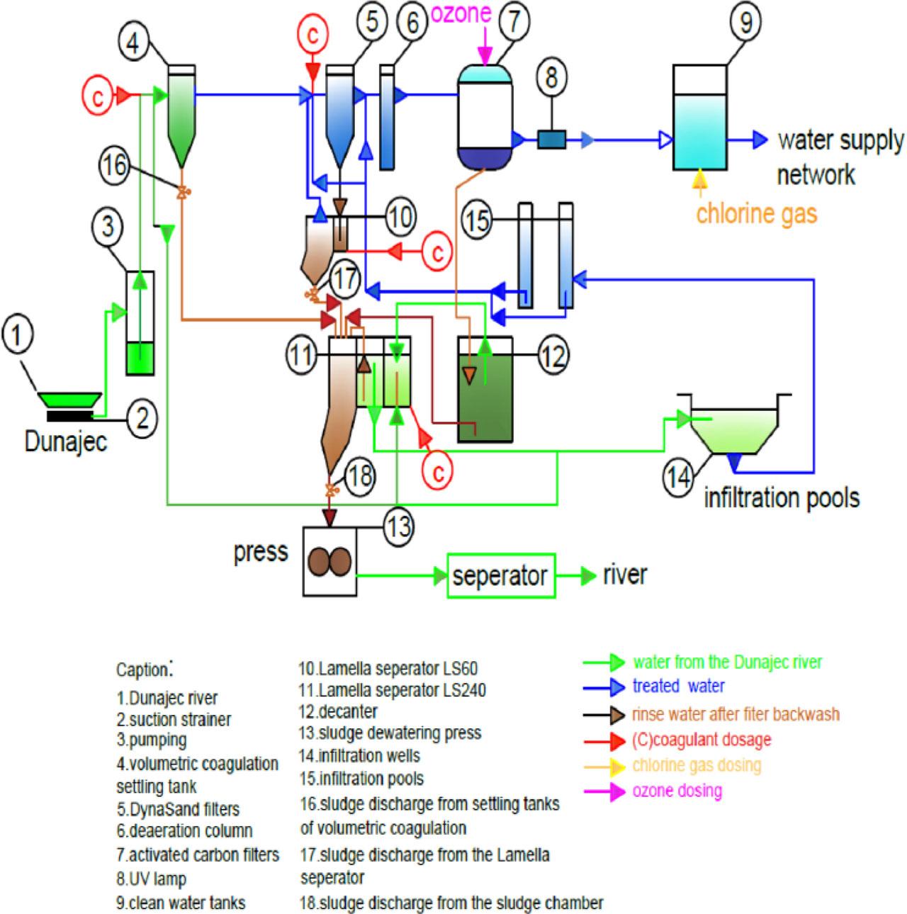 The infiltration intakes (14) comprise six infiltration pools into which surface water from the Dunajec River is pumped. In the case of low turbidity, water from the Dunajec River is pumped directly to the pools, while in the case of high turbidity, water from the river is pre-treated in Lamella settling tanks. The total area of the infiltration pools is 3,260 m2. The pools are filled with a layer of sand with a thickness of 1 m and a grain size of 0.8–1.0 mm. Then, the water flowing in the ground layer undergoes physico-chemical and biological purification processes and is drawn from the aquifer into the process system by 16 quaternary infiltration wells with a depth of 8–10 m, in the amount of max. 190 m3·h−1. Water from the well can be integrated into the technological system before and after Dyna Sand® filters or, in the case when its quality is good, it is subjected only to physical disinfection with UV rays and chemical disinfection with chlorine gas.