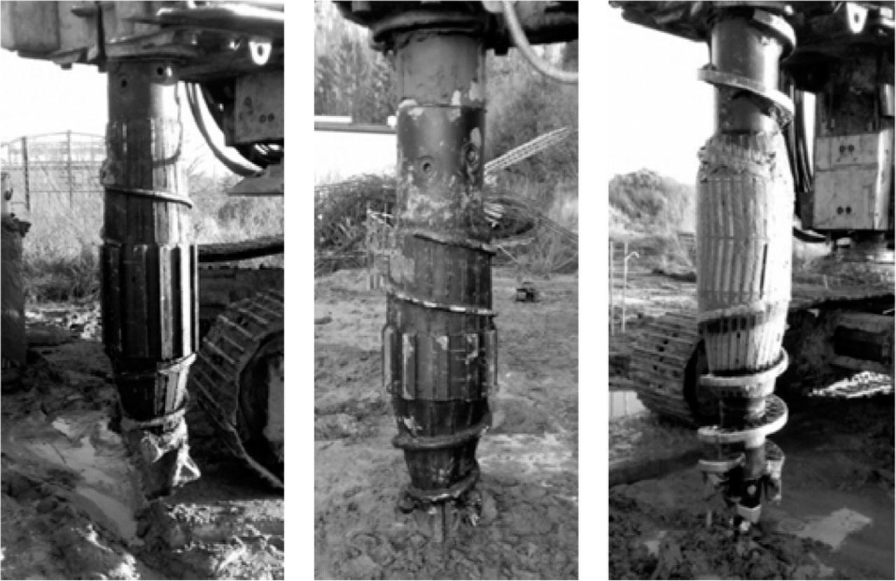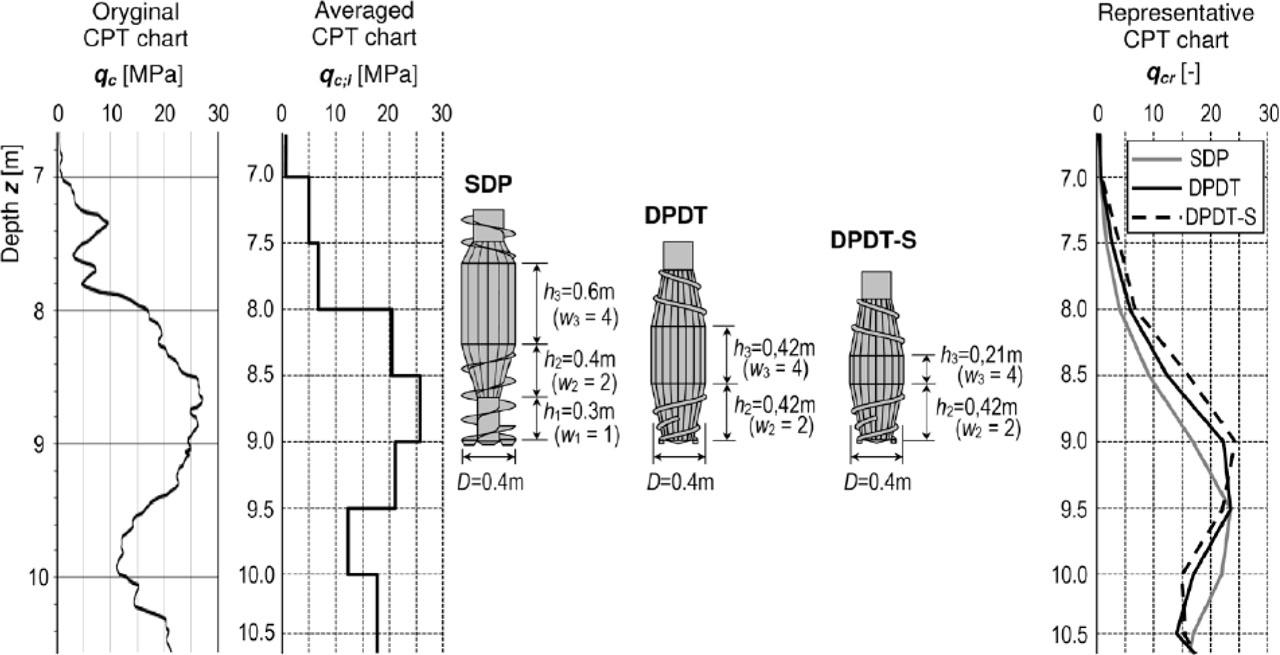 In the field investigations, 6 experimental plots were organized in several locations in northern Poland. In total, over 80 screw displacement piles were made and tested by Budokop Geotechnika. These included 24 research piles and the rest were anchor piles. The geotechnical subsoil structure on the plots was determined using exploratory boreholes, CPTU [4] and DMT [5] soundings and laboratory tests of soil samples (Project Stage 3). Stage 2 was devoted to testing the DPDT and DPDT-S augers (shortened length version) and traditional SDP auger in terms of resistance during penetration into the ground. For comparative purposes, approximately one half of the test and anchor piles were made with DPDT and DPDT-S augers and the other half with the SDP auger. Four test piles were made in each plot, which after obtaining full concrete strength, were subjected to static load tests (Stage 4). All three of the tested augers had a diameter of D = 0.40 m, Fig. 2.