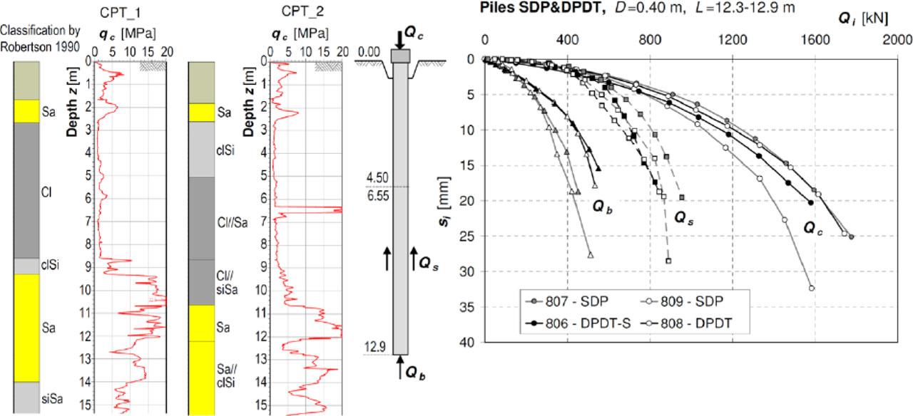 Field static pile load tests were the subject of Stage 4. Tests were carried out with additional pile instrumentation, using vibrating wire extensometers. The aim was to determine the bearing capacity and Q-s characteristics with separate identification of the pile shaft and pile base resistances. Examples of comparative results of static pile tests conducted in experimental plot No. 2 are shown in Fig. 4. Both, these results and other experimental plots showed that DPDT (DPDT-S) and SDP piles are characterized by similar soil interaction parameters (capacity and Q-s characteristics).