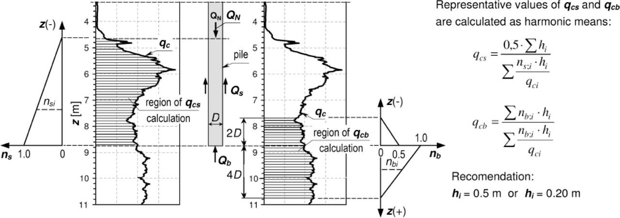 Values of soil unit resistances along the pile shaft ts [kPa] and under the base qb [kPa] were determined from pile load tests. The aim was to find a correlation between the mentioned pile resistances and the resistance of the CPT cone qc. For this purpose, the representative (equivalent) cone resistances qcs and qcb were calculated according to the scheme shown in Fig. 5 (similar to the one proposed in [9, 10]). The values of qcs and qcb were calculated as the harmonic mean of the qc values read from the zones corresponding to the shaft and base of a given pile, with additional consideration of weighting factors (formulas in Fig. 5). In the case of layered soils (cohesionless with cohesive), the qcs values should be calculated separately for each layer (for more, see [6]).