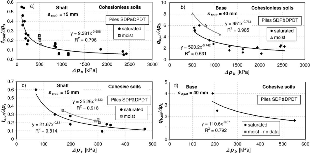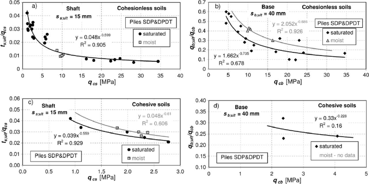 Fig. 6 shows the correlation results with regard to the ultimate ts;ult and qb;ult resistances, which were determined by displacement criteria – for the shaft resistance ss;ult = 15 mm, and for the base resistance ss;ult = 40 mm (10 % of pile diameter D). The above correlations could be unified for piles made by using both DPDT and SDP auger types on account of their closeness, but had to be separated into cohesionless and cohesive soils, and into saturated and moist (unsaturated) soils. Very little research data was obtained in the case of base resistances for cohesive soils, hence the correlation for qb;ult/qcb in Fig. 6d is very approximate and subject to high uncertainty (R2 = 0.16). The discussed correlation was also described with the power function, mainly due to the preservation of the same description as in the other correlations shown in Fig. 6. In the future, this correlation will still need to be verified with further research results.