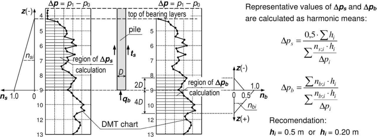 Similar correlations as those described in section 3.1. but between the soil resistances ts and qb and the resistances measured on the membrane of the Marchetti dilatometer (DMT, [4]) were also analysed. In this case, representative parameter Δp [kPa] was adopted, calculated as the difference between resistances p1 and p0 measured directly on the dilatometer membrane during soil testing (Δp = p1 – p0). As for cone resistance qc, a scheme for calculating the representative Δps and Δpb values presented in Fig. 7 was adopted. These values should also be calculated as harmonic means and in the case of a stratified subsoil, separately for cohesionless and cohesive soil layers (for more, see [6]).