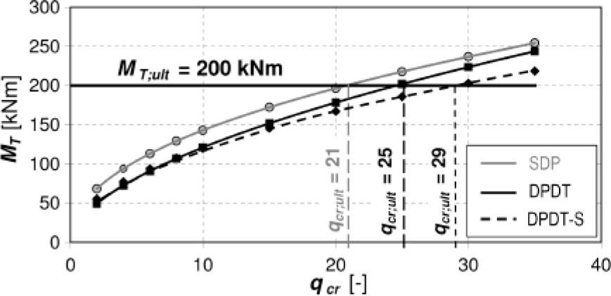 The above formulas are shown in graph forms in Fig. 12. Ultimate resistance values qcr for individual augers and for a pile drilling rig with a maximum torque MT;ult = 200 kNm were also marked.