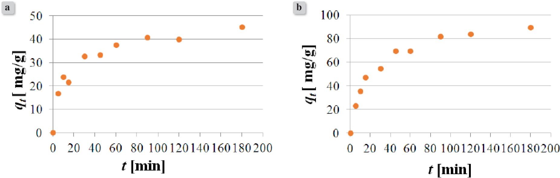 the results of the analysis of two models of adsorption kinetics indicate a better fit of the pseudo-second-order model to the experimental results – a higher value of the R2 coefficient was obtained, and the calculated qe value based on this model is more similar to the experimental qe value; a better fit of the pseudo-second-order kinetics model indicates the chemical nature of the adsorption process;