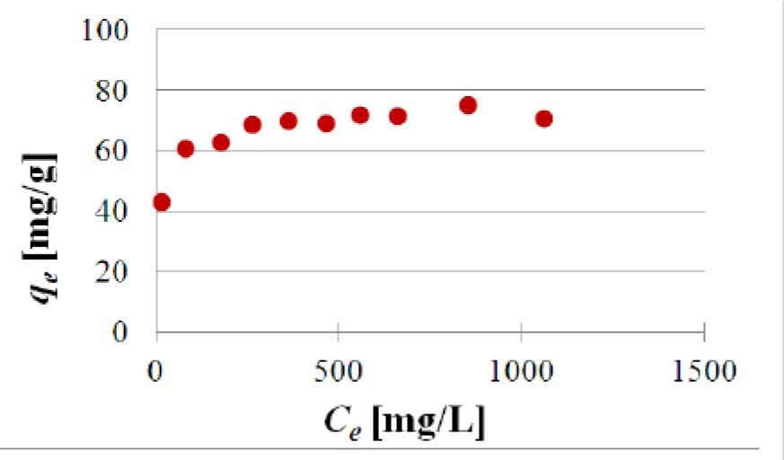 The determination of the adsorption isotherm was carried out with the use of the following process parameters: initial pH of 2.0, contact time of 90 minutes, adsorbent concentration of 2 g/L, and variable initial concentration of dye in the range of 100–1200 mg/L. Based on the obtained results of these experiments, the dependence expressed by equation qe = f(Ce) was plotted (graph of the adsorption isotherm). The shape of the adsorption isotherm indicates the presence of type I adsorption by the IUPAC classification (Fig. 3). This type of adsorption curve indicates adsorption occurring in the case of microporous adsorbents with a relatively small specific surface. This type of isotherm curve is also referred to as the Langmuir isotherm which characterizes single-layer adsorption.
