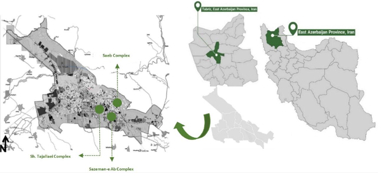 Based on the concept of this study, to measure the impact of open spaces in residential complexes on residents' social interactions, selecting an area that embodies a significant connection between the built environment and social interactions concerning human presence was essential. In this respect, three residential complexes like Saeb, Sazeman-e Ab, and Shahid Tajallaei situated in different neighborhoods of Tabriz City, Iran, were chosen as case study sites (Figure 1). One of the reasons for selecting these three complexes was the presence of differences in the physical characteristics, design, and facilities of their open spaces, as this allows for the comparison of the effects of these designs on the social interactions of the residents. These distinctions included size, accessibility, available amenities (benches, green spaces, playgrounds, and sports), design pattern, and design type (public or private spaces). Another reason for choosing these complexes was the disparity in population density. The purpose was to figure out if complexes with higher population density would naturally provide more opportunities for residents to connect socially. In contrast, complexes with lower population density may require the constraction of opes spaces to promote social interactions.