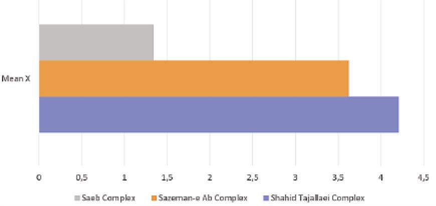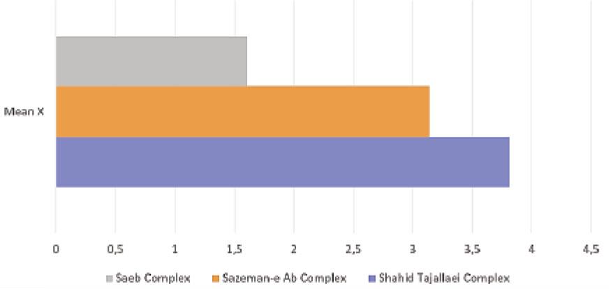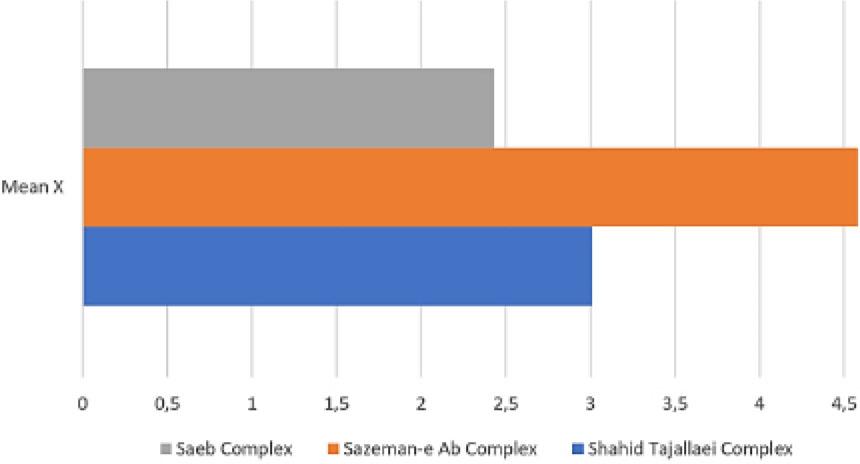 As can be seen in Table 4 and Figure 7, the “Sazemane Ab” complex scored the highest (M=4.11, SD=1.324) and the Saeb complex the lowest (M=1.64, SD=0.663) when analysing factor three, “Consideration of children and the elderly in the design of the housing complex”. The Sazeman-e Ab complex has managed to attract residents by designing safe, attractive and diverse open spaces for children. These spaces are specifically designed for children, providing them with play equipment and spaces that encourage their creativity and physical activity.