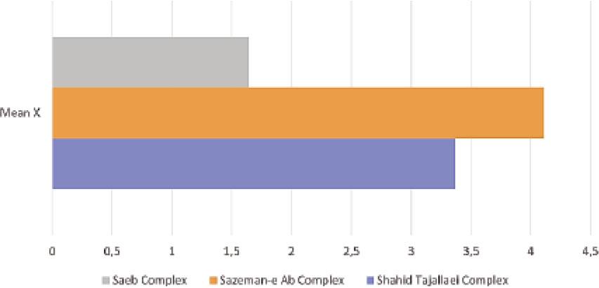 In view of the discussion on the importance of open spaces in residential complexes for promoting interaction and communication among residents, the second factor assessed in the questionnaire was “residents' satisfaction and their desire to be present in the complex”. Considering the results and the points obtained, as the Saeb residential complex was designed in a linear pattern, sufficient open space for the buildings was not considered. It is clear that the residents' responses to the questions related to this complex were all negative and received a low score (M=1.34, SD=0.43). Although this residential complex has open spaces, the existing open spaces play the role of filling the remaining spaces between the buildings due to the lack of attention to the design principles. In addition, the use of the area by residents is limited due to the encroachment of cars and footpaths and the lack of provision of dedicated areas for playing, walking or sitting, and resident satisfaction is lower. In contrast, the open spaces of Sazeman-e Ab (M=3.62, SD=1.720) and Shahid Tajallaei (M=4.21, SD=0.902) residential complexes are such that residents have a great desire to spend time there, considering the appropriate design of the environment, the creation of spatial diversity, the use of different vegetation and the consideration of the variety of different functions such as sitting and walking, so that more favorable conditions for creating neighborly relations have been created (see Table 3 and Figure 6).