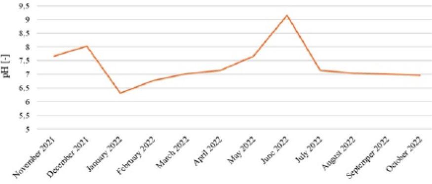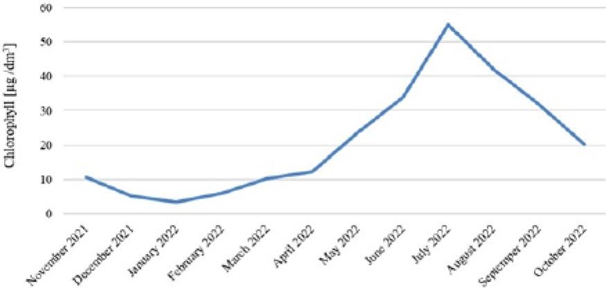 Observation of the chlorophyll “a” content in the waters of the Siemiatycze reservoir based on Table 3.1., determined seasonal variations in its contents presented at Figure 3.5. Higher concentrations occurred during the summer, it is associated with the start of the growing season. An intensive process of photosynthesis in the water depends on positive temperatures and sunlight increase. Typically, an increase in the concentration of chlorophyll “a” is followed in spring, although in 2021–2022 the winter and snow cover lingering persisted to the end of April, hence the shift of the growing season and a significant increase in the concentration of chlorophyll “a” in the summer months.