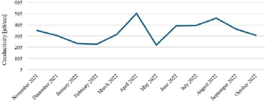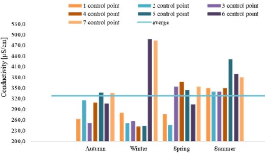 | Conductivity [µS/cm] | Autumn | 239.40 | 302.71 | 354.90 | 309.70 | 35.83 | 9.58 |