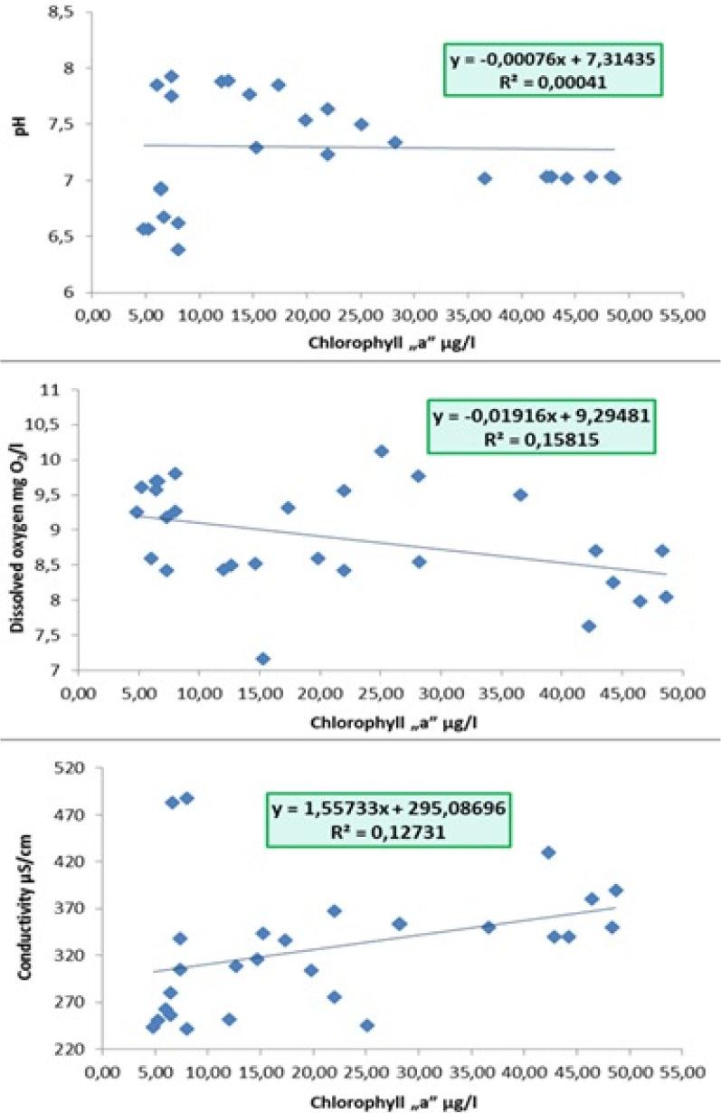The concentration of chlorophyll “a” in the water is an important water quality parameter and threats blooms, at the same time it informs about the primary production of biomass and abundance of nutrients in the water reservoir. This indicator is related to cause-effect dependencies with the concentration of dissolved oxygen, concentration of carbon dioxide, pH, water temperature, turbidity, insolation, as well as concentrations of bioavailable forms of nitrogen and phosphorus. In addition, the concentration of chlorophyll “a” is also a function of the number of phytoplankton in the water [25]. In the paper has been proven slight dependency between concentration of chlorophyll “a” and the dissolved oxygen and also between concentration of chlorophyll “a” and electrolytic conductivity.