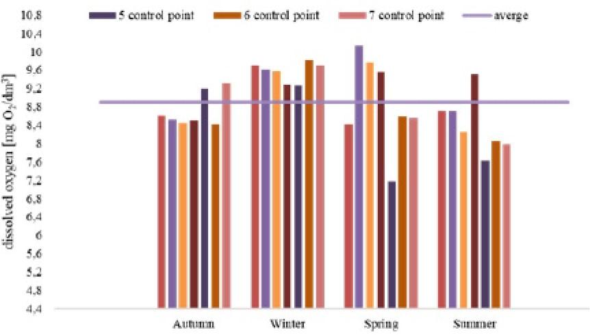 | Dissolved oxygen [mg O2/dm3] | Autumn | 8.17 | 8.71 | 9.60 | 8.72 | 0.45 | 0.12 |