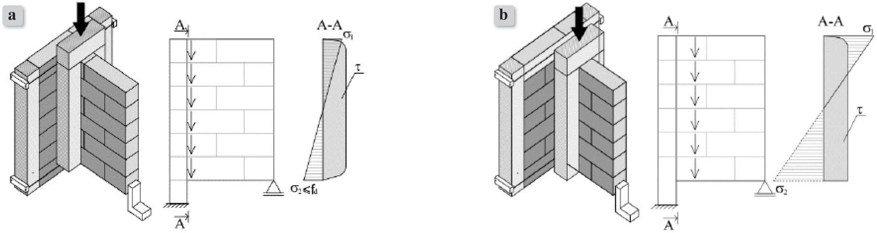 Test scheme and distribution of normal and shear stresses at wall conection, a) unreinforced and reinforced shear stress before cracking, b) reinforced shear stress with bending after cracking
