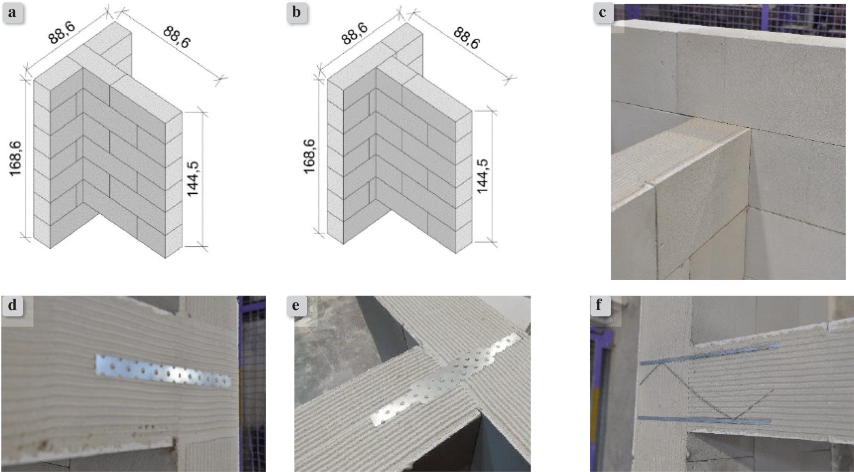 In the test model series conventionally labeled as bP, a traditional masonry bond was used between the flange and the web (Figures 2a, 2c). These elements were treated as reference models. In the remaining three series, the connection between the flange and the web of the test model was established using connectors (wall geometry shown in Figure 2b).