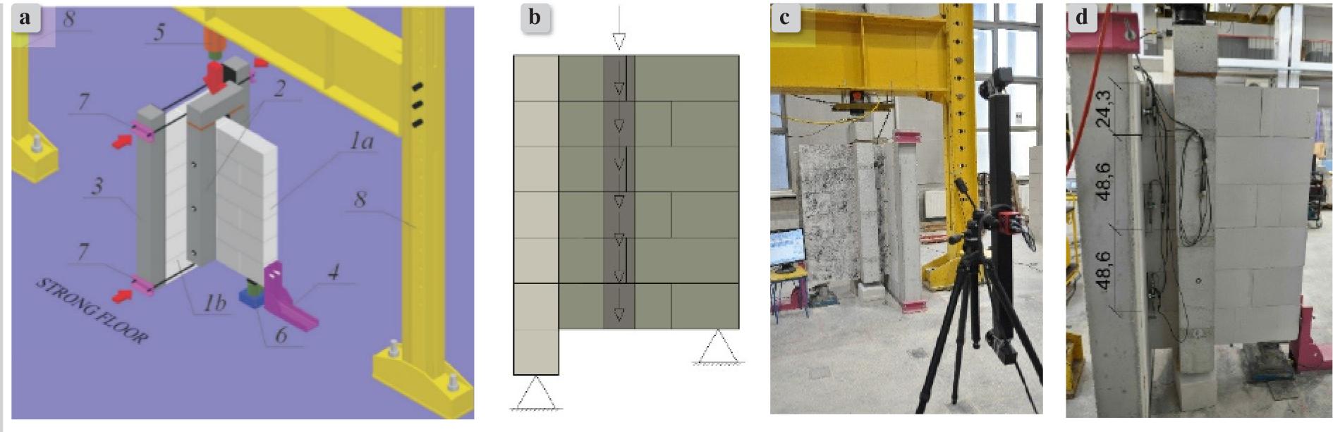 The research was conducted using a custom-designed test setup shown in Fig. 3a. The test model consisted of two interconnected wall segments (1a, 1b) equipped with restraining elements (3) and placed on a high-capacity loading plate beneath a steel frame (8). The shear force acting on the connection was applied using a hydraulic actuator (5) and recorded with a strain gauge load cell. The structural response was measured using an inductive force transducer with a capacity of 250 kN and (measurement class ±1%). To stabilize the test element, an initial compressive stress of 0,1 MPa was introduced in section 1b using reinforced concrete elements (3) and steel tendons (7). The models were loaded in a single cycle until failure. The vertical load generating shear and bending was applied uniformly along the entire wall height via reinforced concrete elements (2), ensuring stress uniformity in the connection. The actuator generating the load was positioned 28 cm from the wall junction. The static scheme of the test setup is shown in Fig. 3b.