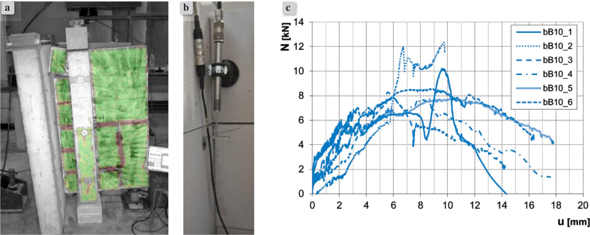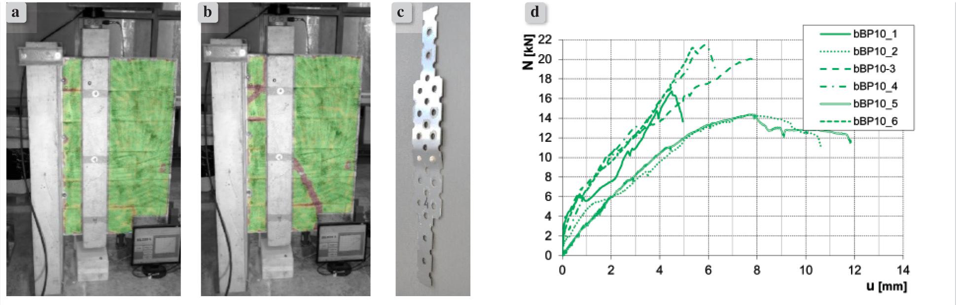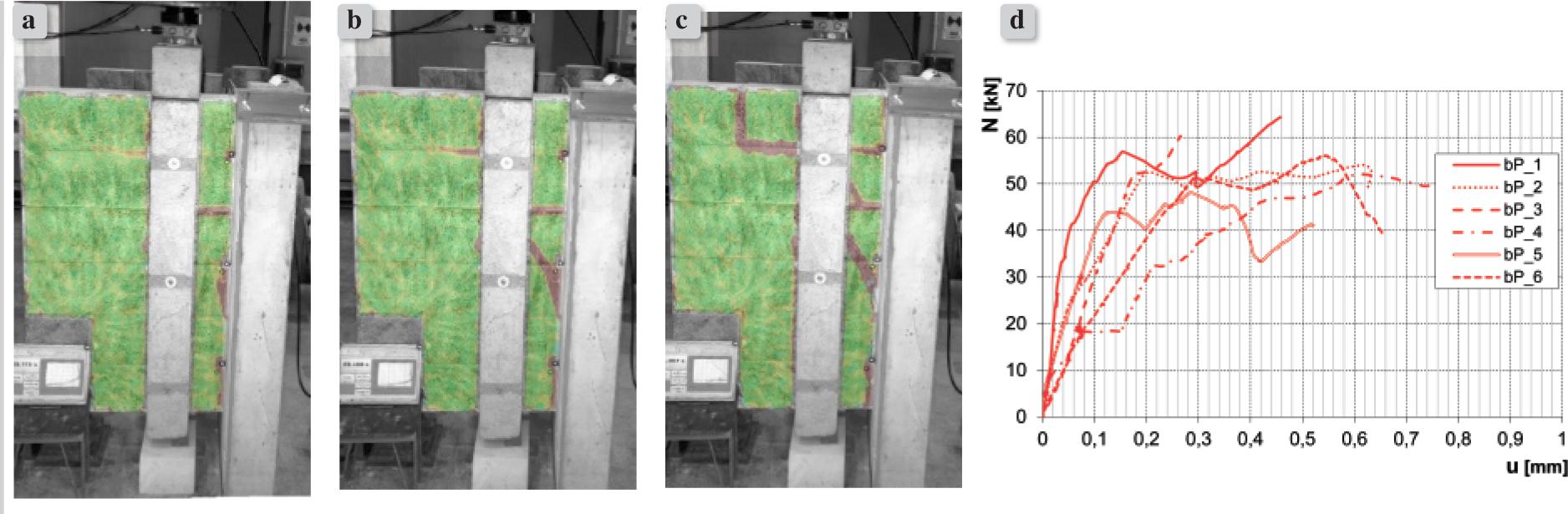 The behavior of all reference elements was similar. In the initial loading phase, no cracking sounds were heard, and no visible cracks were observed. Optical displacement measurements revealed only a slight delamination of the masonry layers at the bed joints near the connection (Fig. 4a). This phase lasted until the first diagonal cracks appeared, running from the connection to the load-transferring column (Fig. 4b). Further load increase caused a significant development of the existing cracks (Fig. 4c). The maximum recorded force was observed in this phase. As the loading continued, relative displacements increased significantly. After failure, the test setup and the test model were dismantled. Numerous cracks were found in the plane of the load-transferring column. The behavior of the connection under loading was reflected in the load-displacement (N–u) graphs for the connected walls (Fig. 4d).