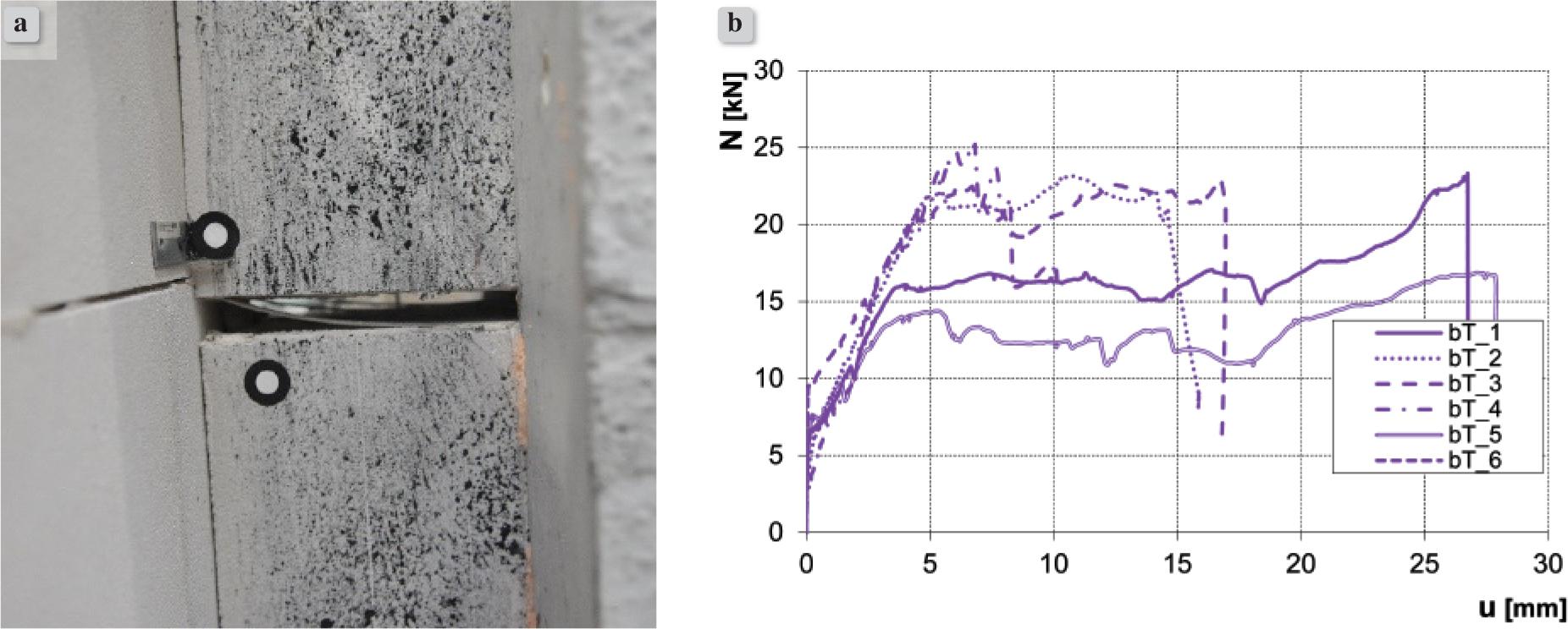 Results of the wall tests for the bT series: a) delamination in the bed joint (bT_4), b) relationship between applied force and vertical relative displacement (N-u)