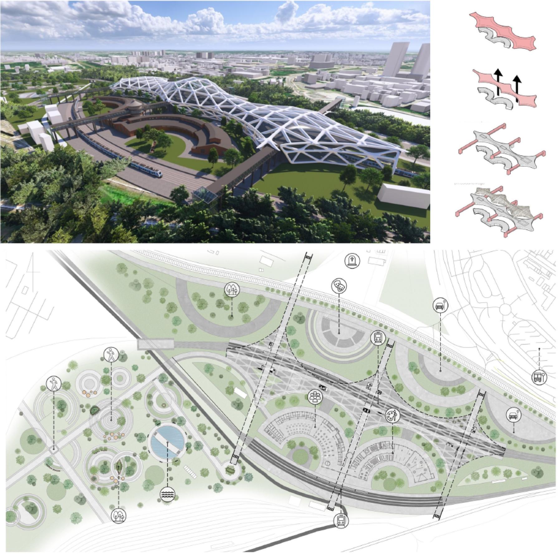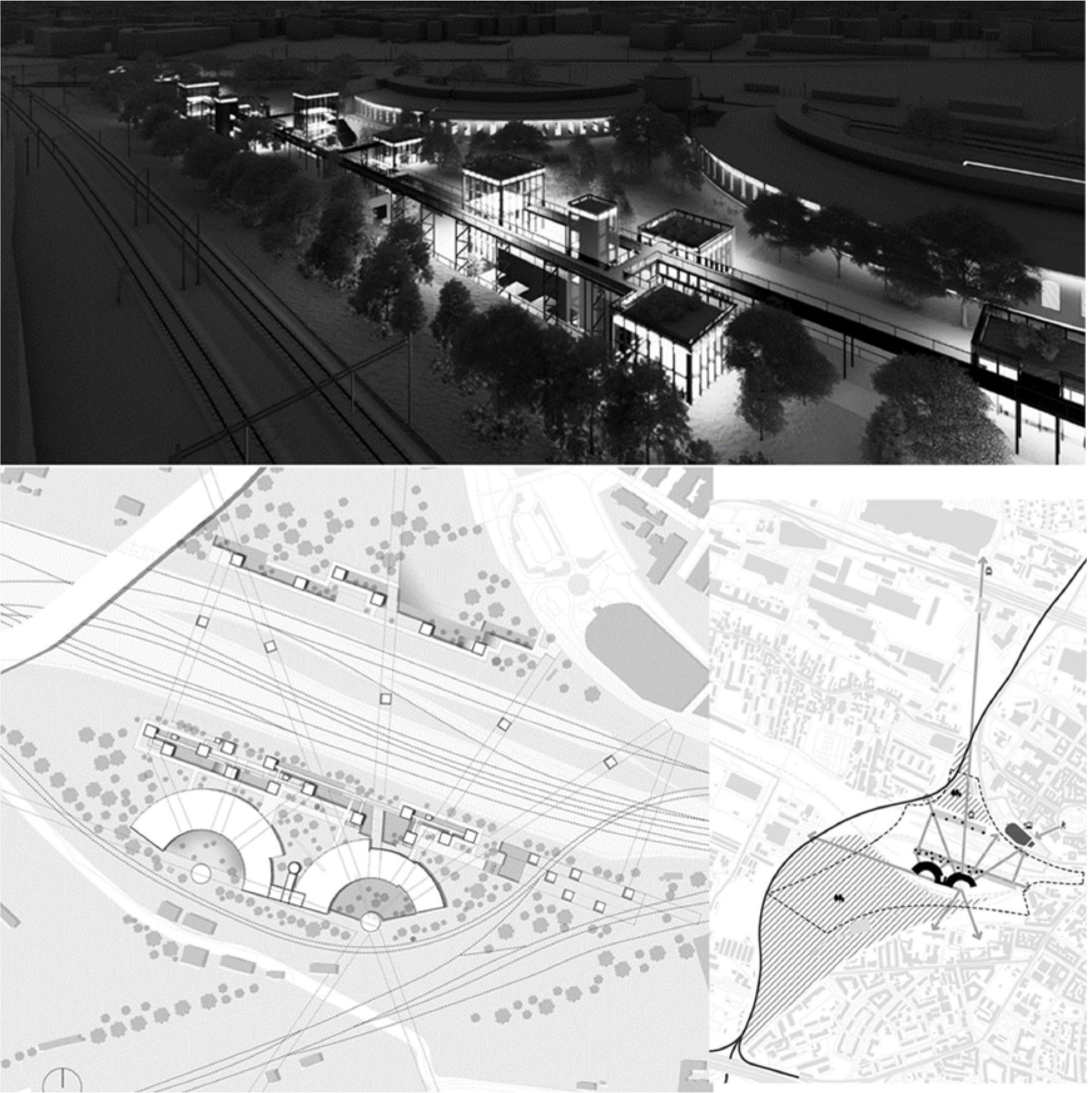 | program | multifunctionality; inside the structure there is a railway station platform, whereas in the adjacent semi-circles (including the fan buildings of the locomotive depot) there is space provided for the development of social initiatives, coworking, recreation, culture and art, in compliance with the local community’s expectations shown in the pre-design survey |