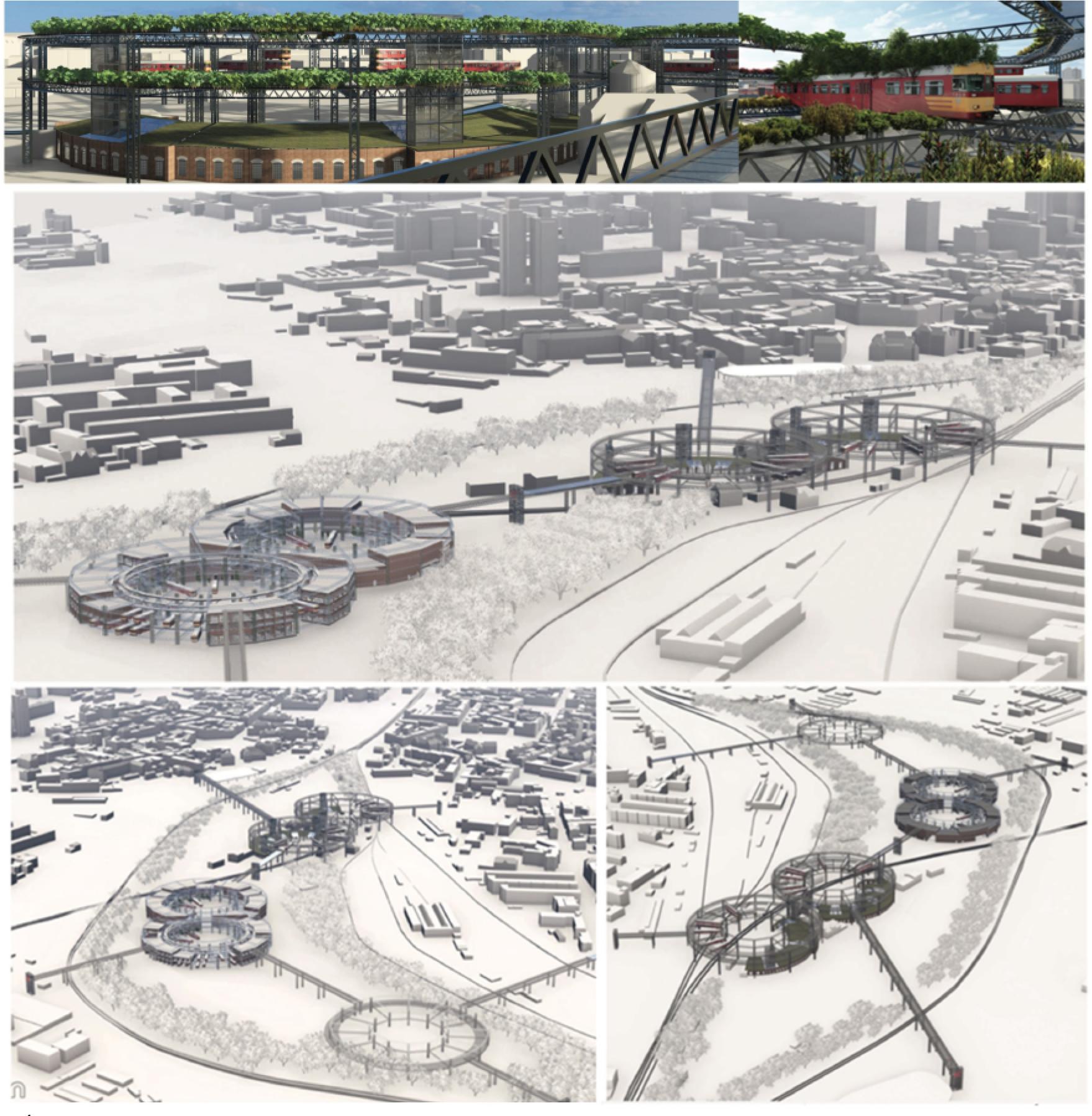 | new connections | an elevated meandering footbridge between the buildings provides a two-storey public space which, together with the subways, connects the districts to the north, the depot and the green areas to the south; a narrow-gauge railway is designed in the southern park |