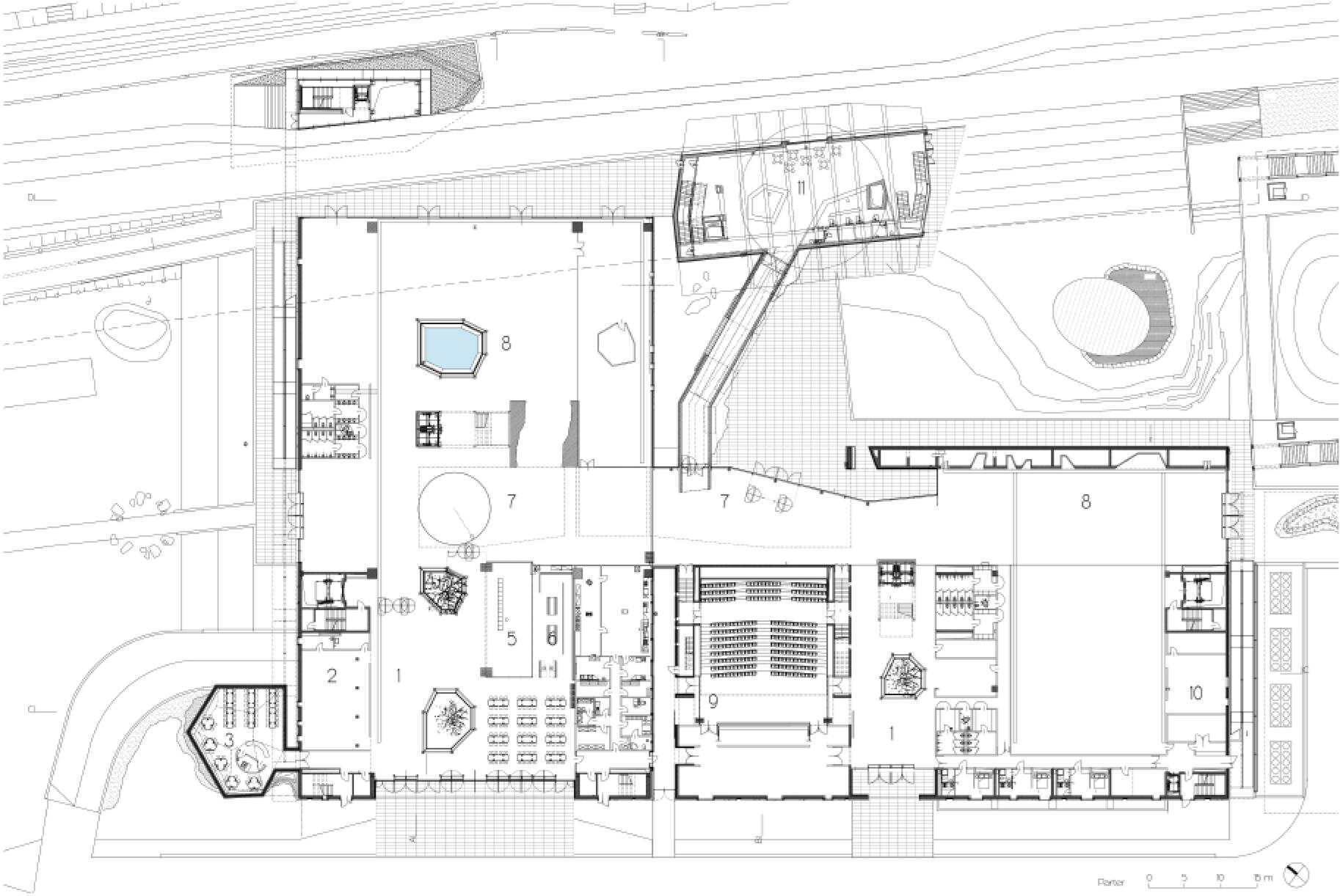 First floor plan. 1 – exhibition; 2 – school laboratories; 3 – outdoor terrace; 4 – office; 5 – conference room; 6 – hall; 7 – dressing room; 8 – cafeteria; 9 – technical room; 10 – planetarium. Author’s drawing