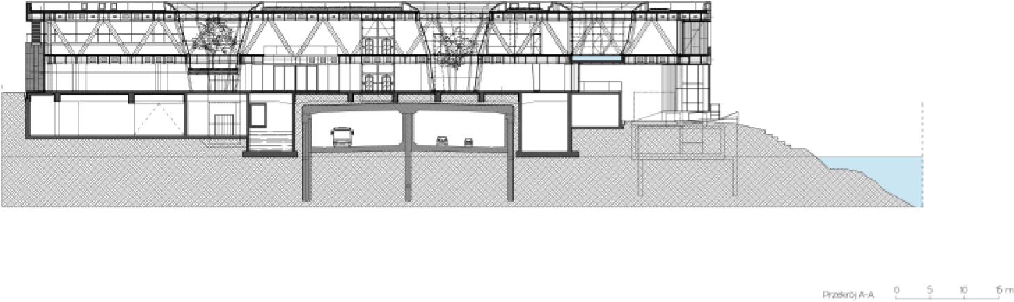 In his book Landscrapers Aaron Betsky wrote: “Buildings replace the ground. This is the original sin of architecture” [15]. It happens because as they replace the ground buildings take up space, sunlight, air et cetera. Copernicus Science Centre has its place in the developing family of new designs of RAr-2 Laboratory of Architecture, designs which examine the notion of a building as species of social landscape. A building constitutes a social landscape within which public roads and exhibition spaces permeate in several points. The objective was to create a public building with very complex programme: a unique crossroads for tourists visiting the centre or for individuals strolling along the boulevards located along the Vistula river. The configuration of the design on three various levels – the roof, the exhibition hall and underground workshops and storages – constitutes an equivalent of the cross section sketched in the history of the design, from barely formulated speculations at the stage of competition design to strong construction of the realised design. From the very beginning the idea of the design was to accumulate the exhibition areas and visitors in the “integration machine” from the one side and in the landscape from other. Authors wished to create a smooth connection with the river bank of Vistula.