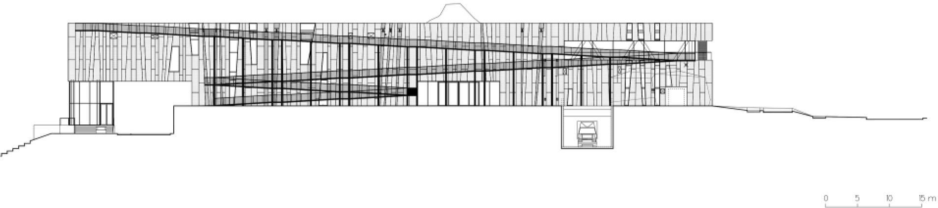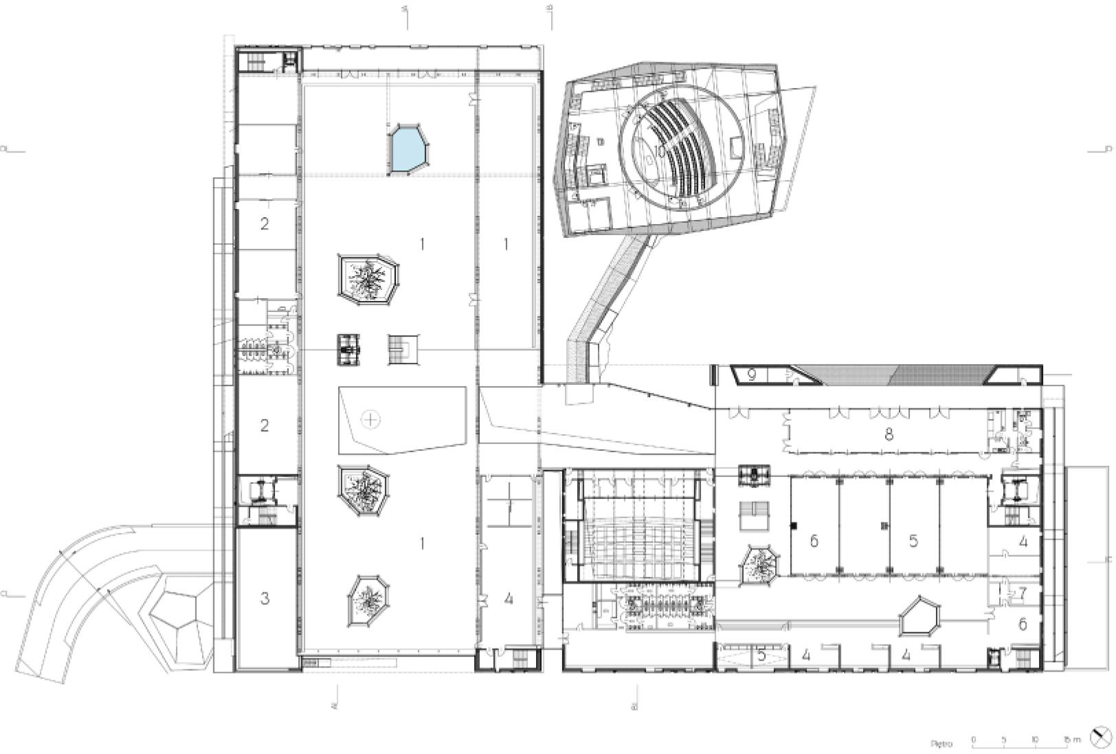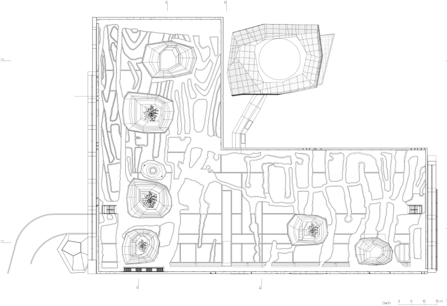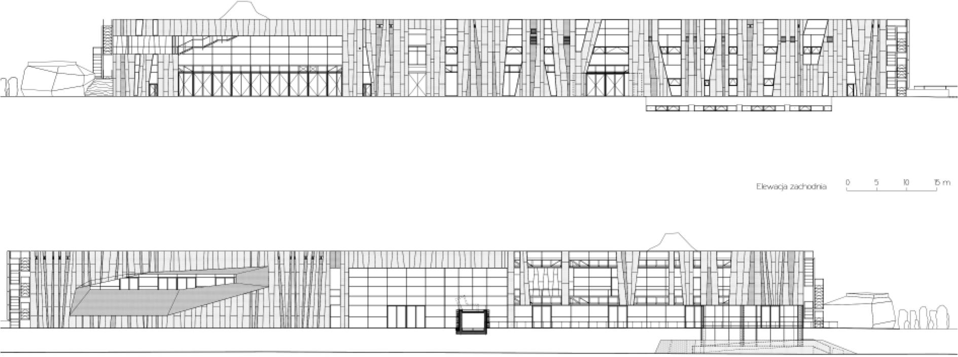 The design submitted for the competition suggested that the planes of individual levels of the building constitute a landscape: the low levels were connected with the river. In terms of architecture the design was poorly developed. At the early stage the drawing was supposed to constitute solely a concept imitating the structure of perforated large mass (mass of the ground). Whereas for Eisenman in his design of the Culture Centre in Santiago de Compostela and in FOA, the design of harbour terminal in Yokohama, the language of architecture consisted of a fold [21] in case of Copernicus Science Centre this was constituted by a projection of archetypical and iconic cave. The common feature for these designs is the play with emptiness, not with matter.