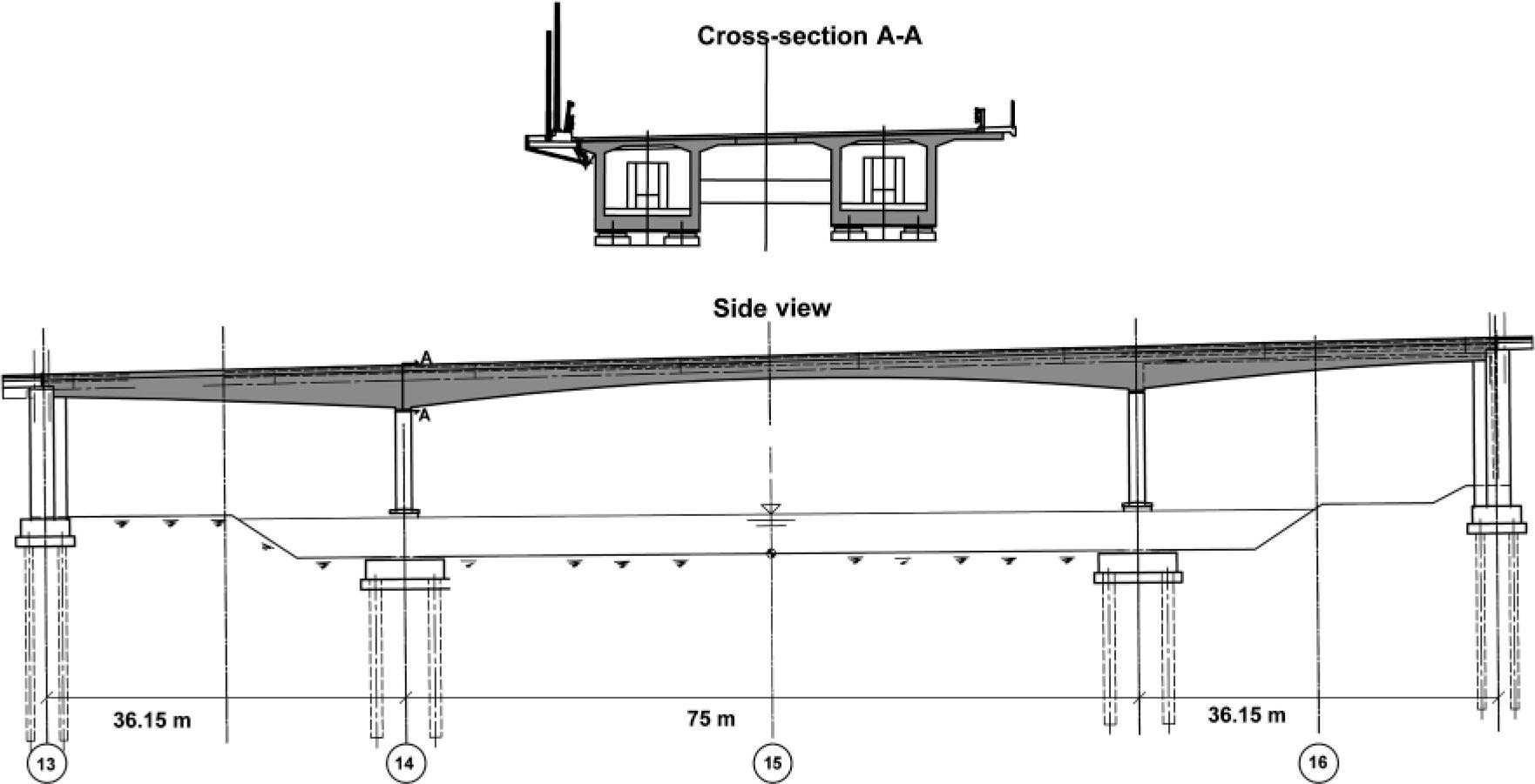 To test the proposed methodology of integrating an AI algorithm with a digital twin concept for damage identification and prediction of bridges, it was applied to a real reinforced concrete box girder bridge. Soroksári bridge was constructed in 1990, spanning a branch of the Danube River in Hungary as part of the M0 motorway. This bridge had a unique superstructure design containing two variable-height reinforced concrete box girders with integrated side cantilever plates to support the pavement. The total cross-sectional width of the bridge was 21.94 meters, and the specific section under investigation had a length of 148.55 meters. A detailed side view and cross-section of the bridge are provided in Fig. 1. The original monitoring system on the Soroksári bridge consisted of 8 sensors measuring temperature and 10 sensors measuring longitudinal elongation in different cross-sections. However, for this research, in order to acquire more comprehensive data regarding the superstructure’s behaviour, seven additional strain gauges were also installed within one of the box sections with the help of the Hungarian Public Roads Company as the bridge operator and the Structural Laboratory of Budapest University of Technology and Economics, Faculty of Civil Engineering. More details about the types and locations of the original and the additional monitoring devices, as well as about the bridge itself are provided in Asseel et al. [17].