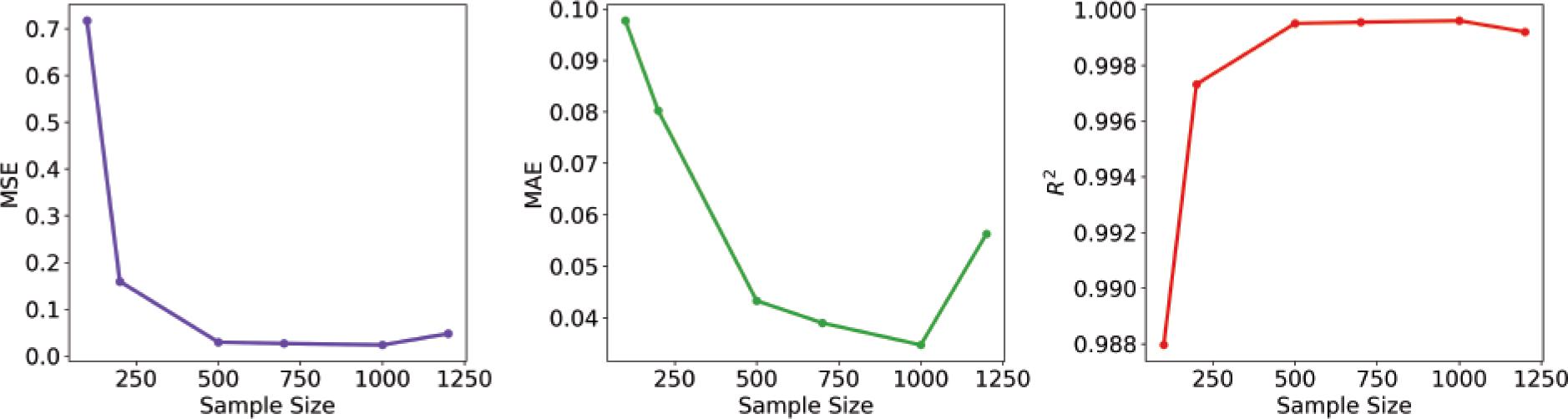 Effect of sample size on FNN performance metric: mean square error (MSE), mean absolute error (MAE) and coefficient of determination (R2)