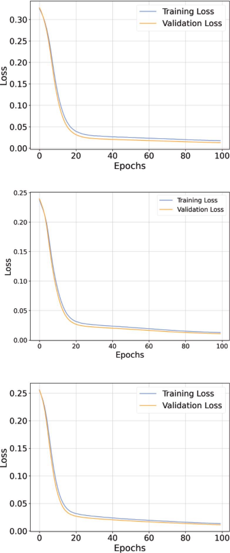 Figure 3 illustrates the training and validation loss curves for each model. Training loss measures how well the model fits the data it was trained on, while validation loss evaluates the model’s performance on unseen data, serving as an indicator of generalization. All versions showed a quick decrease in both losses during the initial epochs before stabilizing. The model with 17 locations achieved the lowest final loss values, indicating a well-balanced fit with minimal overfitting. In contrast, models with 25 and 40 locations maintained low losses but exhibited slightly higher residual errors, reflecting the increased complexity in capturing more detailed structural behaviour.