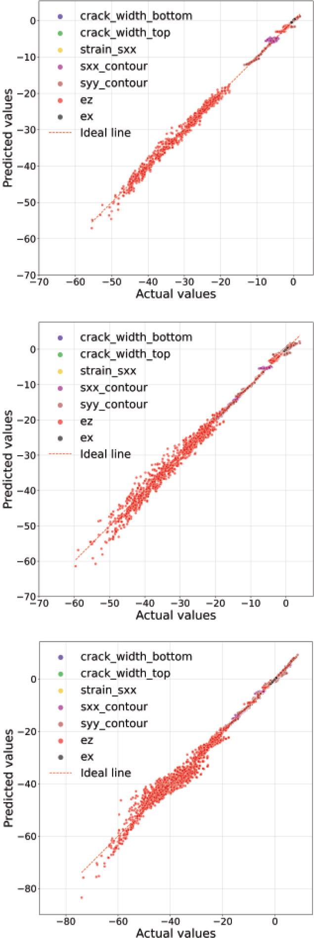 Figure 4 presents scatter plots comparing predicted versus actual values (coming from the FE model and used to train the FNN), for FNN models using 17, 25, and 40 data collection points. All plots show a strong diagonal alignment, indicating high predictive accuracy. The 17-location model has the tightest clustering, while the 25-location model shows slightly larger deviations. Though all models maintain robust predictive performance, the 40-location model exhibits a broader spread at the extremes, suggesting increased challenges with higher dimensionality.