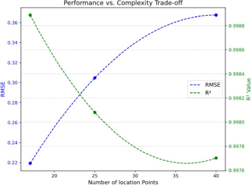 Similarly, Fig. 6 illustrates the performance versus complexity trade-off by plotting RMSE and R2 values against the number of data points. The RMSE (blue line) increases with more locations, while the R2 value (green line) slightly decreases, reinforcing the observation that model complexity impacts performance. Despite these variations, the consistently high R2 values across all versions highlight the models’ overall effectiveness in predicting structural behaviour, emphasizing their potential for practical applications in structural health monitoring.