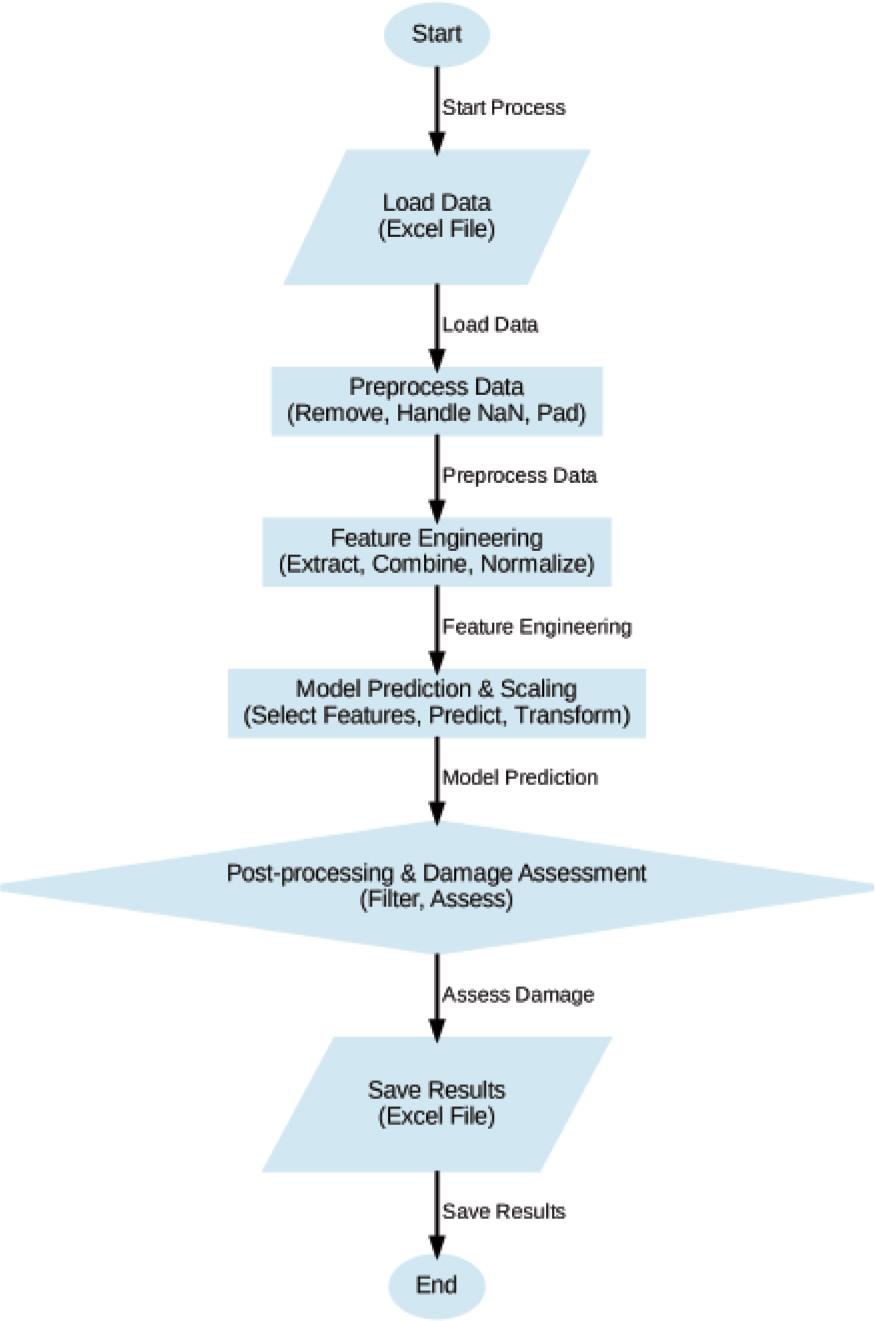After training the FNN model on the data from the Digital Twin, it was used to make predictions when fed with sensor measurements from the physical bridge. But first, those readings had to be prepared accordingly, the workflow involved establishing baseline sensor readings and making necessary adjustments using the FEM model to compensate for the effects of the self-weight of the bridge, because the sensors were installed after the construction of the bridge (so real sensor measurements do not include the effect of self-weight, while virtual sensors in the FE model did include that). After the sensor readings were prepared to make predictions, they underwent preprocessing to ensure consistency and compatibility with the FNN model. The same MinMaxScaler from the sklearn library [31] was used when the Feedforward Neural Network model was trained, scaling all features between 0 and 1. The normalized dataset was subsequently used to predict crack widths, stresses, and deflections in critical structural points, based on real sensor measurements. Predicted values were scaled back to their original ranges using inverse transformations, ensuring interpretability in the context of physical measurements. The steps of the used code are illustrated in Fig. 7.