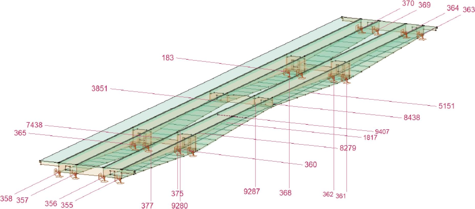 For demonstration purposes, predictions were made using the pre-trained FNN algorithm and real sensor readings to test the FNN model. In this study, we used data collected over one hour on a summer day at 5:00 PM, coinciding with peak rush hour traffic. This specific time frame was selected to capture the bridge's response under high traffic loads, providing a representative assessment of its performance during conditions of maximum utilisation. The predictions were conducted for 25 specific locations on the bridge (Fig. 8) that represent the locations of the sensors and other critical locations presented in Table 2, each identified by a distinct node number extracted from the FE model.