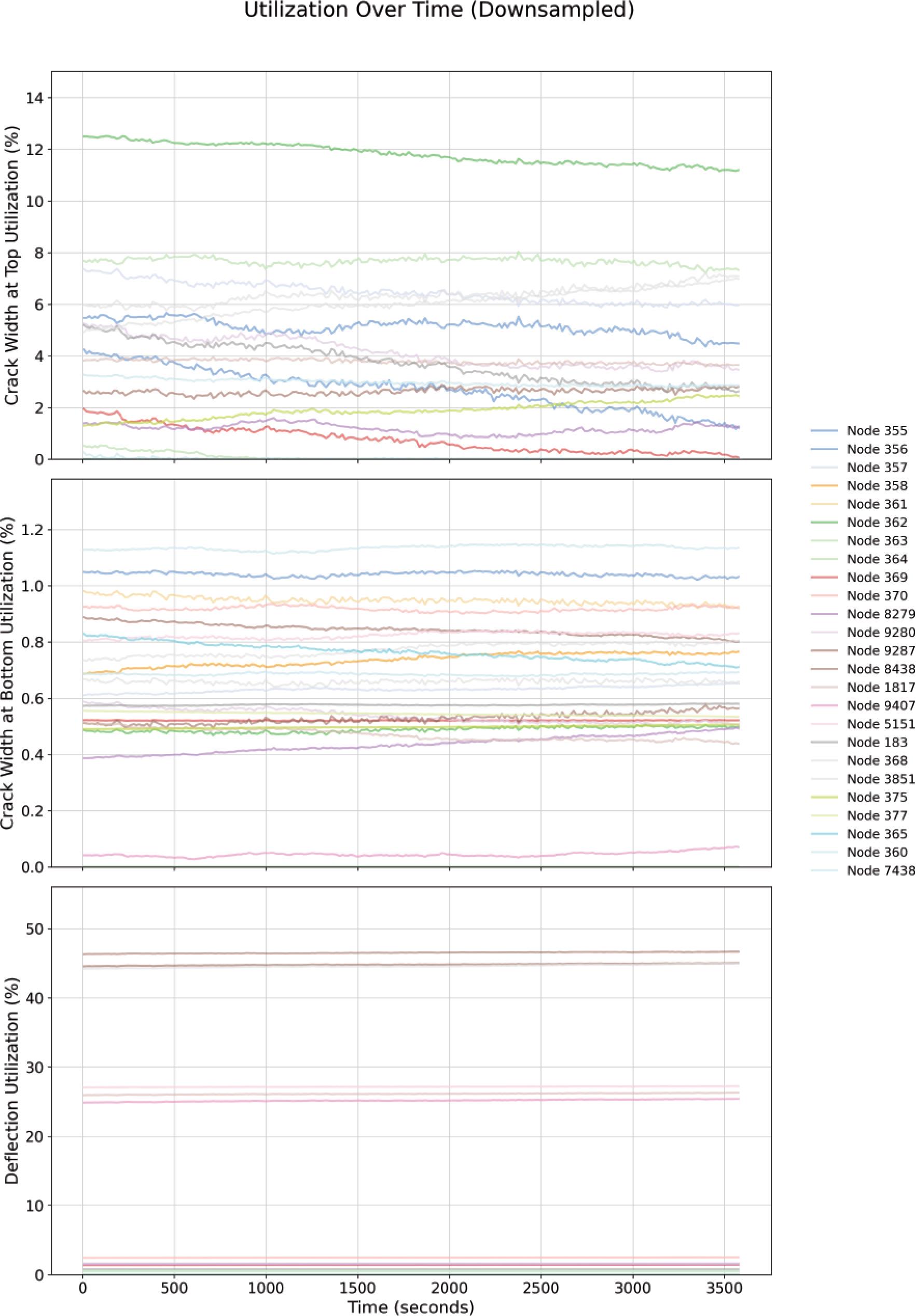 The calculated utilisations (limit value/predicted value × 100) at these locations were evaluated in serviceability limit state (crack width and deflection) based on the previously defined limit criteria to assess the structural performance. Based on the calculated utilisations shown in Fig. 9, the results indicated that the bridge was satisfactory for the serviceability limit state, demonstrating adequate performance under the currently acting conditions.