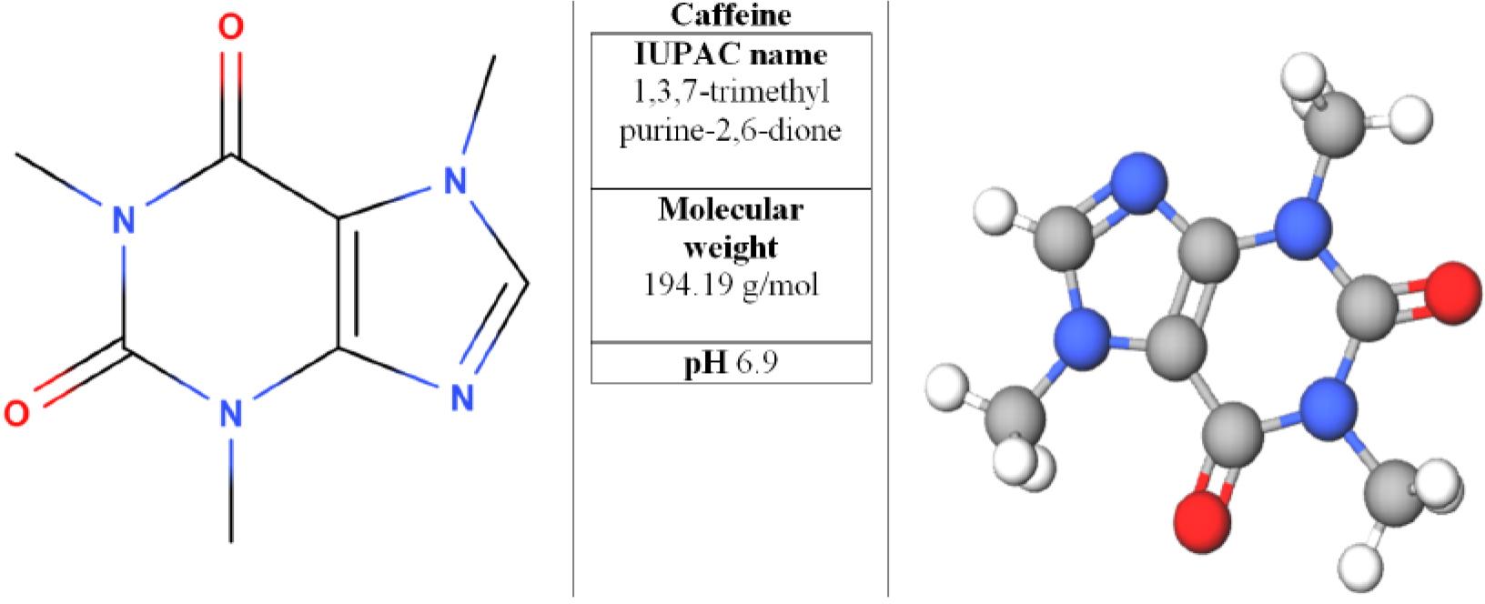 Caffeine is a pervasive natural compound with a molecular weight of 194.19 g/mol, recognized by its international union of pure and applied chemistry (IUPAC) name as 1,3,7-trimethyl purine-2,6-dione. This odourless, solid substance has a mild solubility in water, ranging from 10 to 50 mg/mL at 73°F, and is characterized by a pH of 6.9. It melts into a tasteless, dry, white powder at 178°C (Figure 1). Found in seeds and leaves of coffee plants, it is also prevalent in chocolate, cocoa, cola, and certain medications, particularly pain relievers. As the primary component of coffee, caffeine stimulates the human neurological system. Its hydrophilic nature is reflected in its octanol-water partition coefficient, with values from - 0.04 to -0.01, indicating high solubility. The acidity of caffeine is defined by its pKa value, which spans from 5.3 to 14, showcasing the strength and proton-donating ability of the acid within the molecule. High concentrations of caffeine in water systems can signify pollution, given its stability and solubility [9], [10].